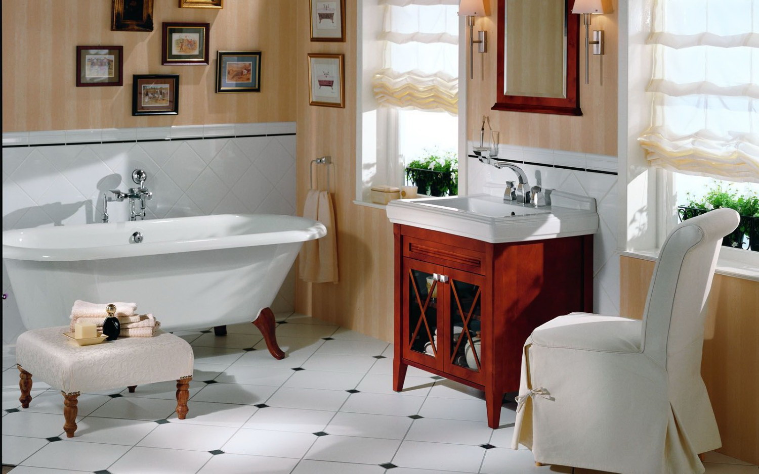 Esquemas de cores: Esquemas de cores populares incluem um piso xadrez preto e branco de telhas, com um sotaque corajoso, como vermelho cereja, turquesa, rosa quente.