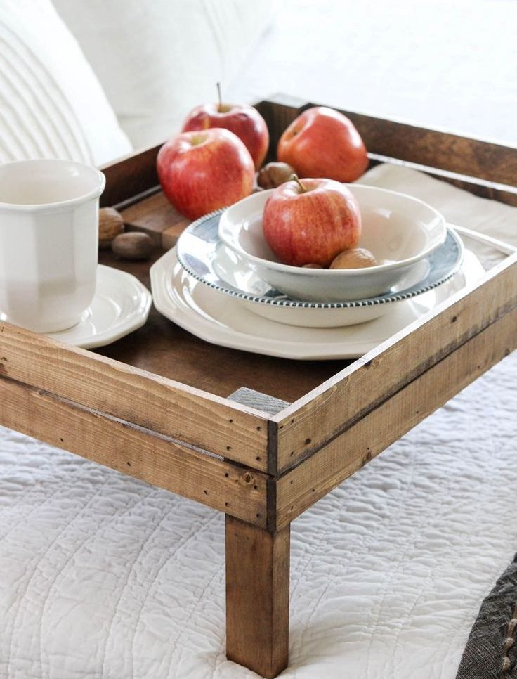 Bandejas - este é um dos itens de cozinha que usamos em nossa vida diária com bastante frequência. Portanto, considere tornar a bandeja multifuncional. Ele pode ser usado para servir o café da manhã na cama e transformá-lo em uma mesa de cabeceira com um movimento do pulso.
