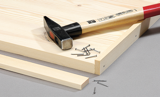 Em seguida, use os parafusos para fixar as pernas ao quadro. Cole e pregue a mesa ao topo.