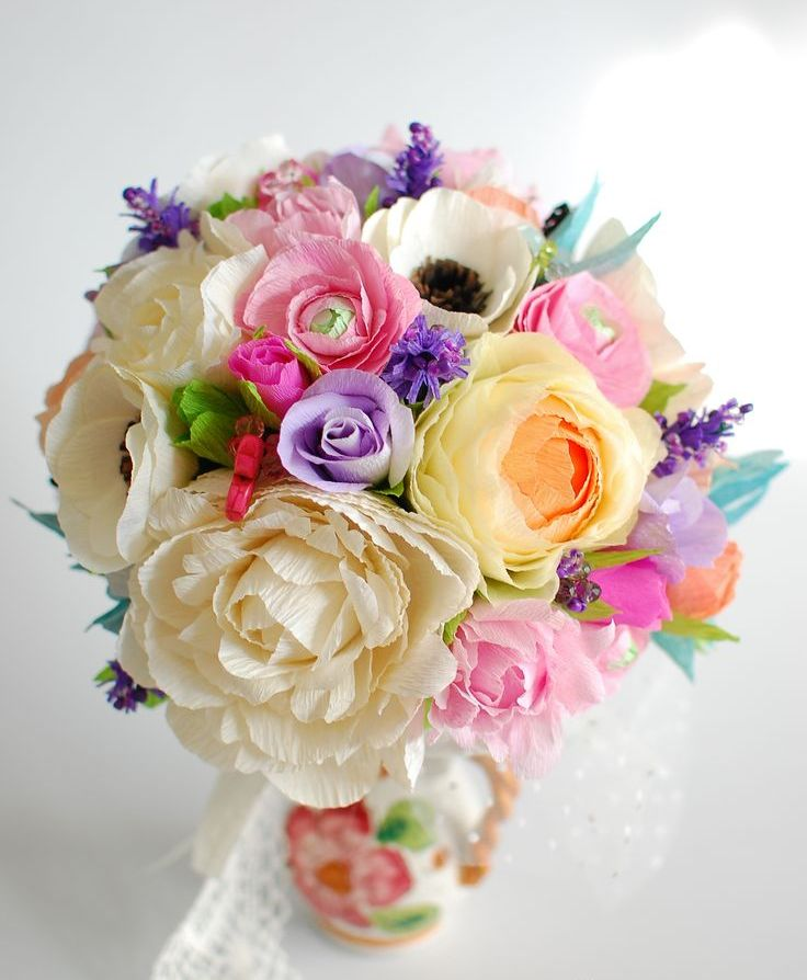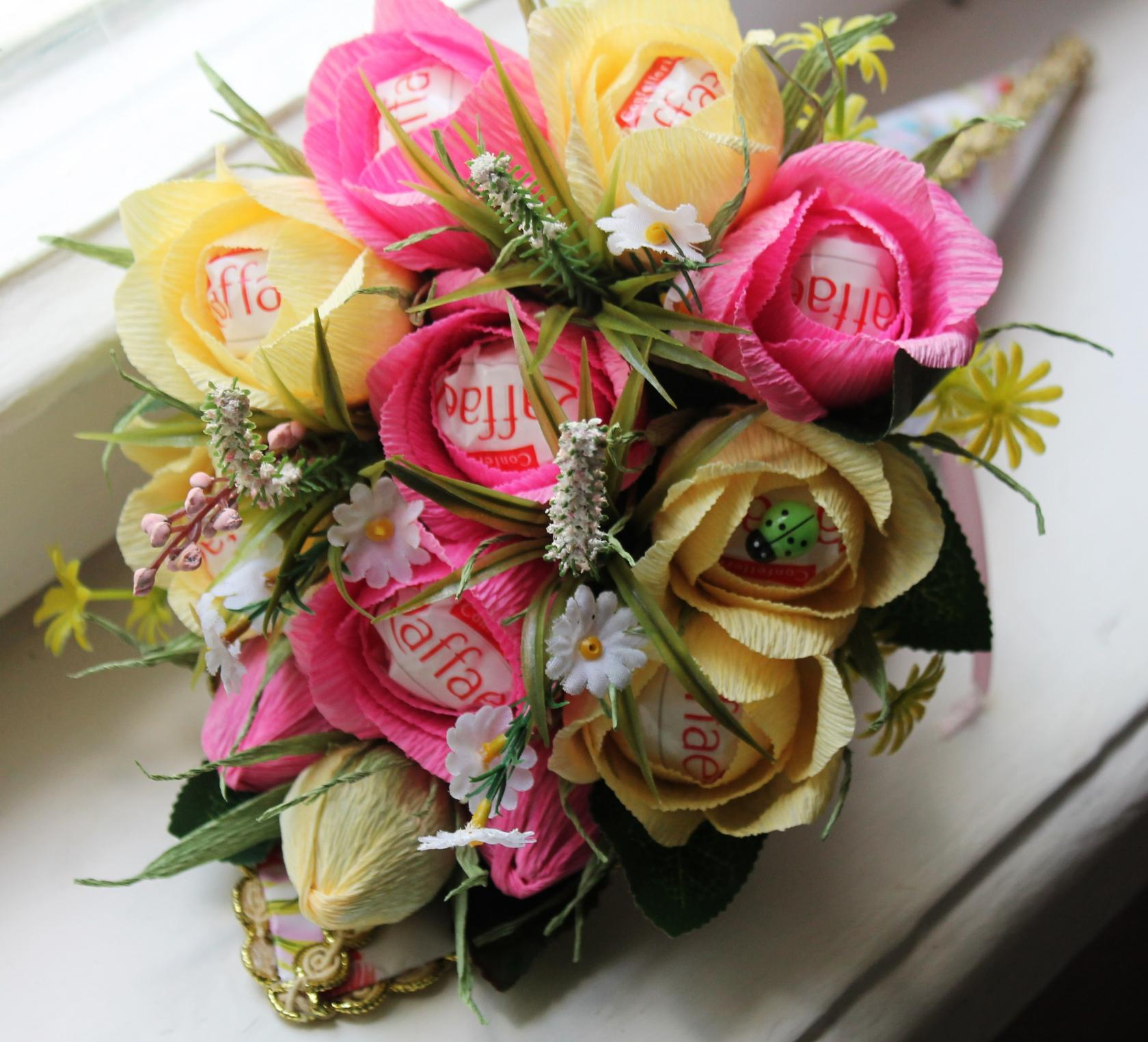 - Um buquê pode consistir de flores frescas e reais e de papel doce.