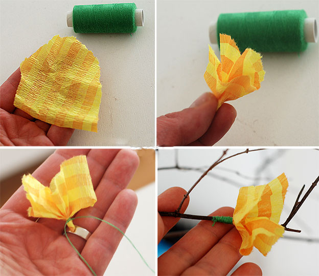 Para fazer isso, você precisa conectar vários ramos macios de abeto (ou melhor ainda, pinho), generosamente decorá-los com flores de papel de doces.