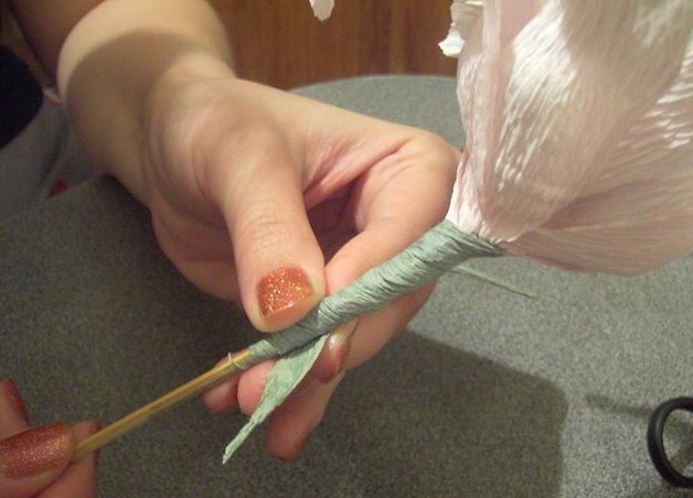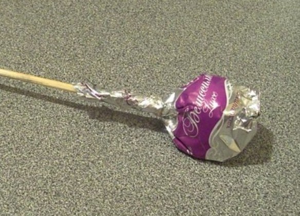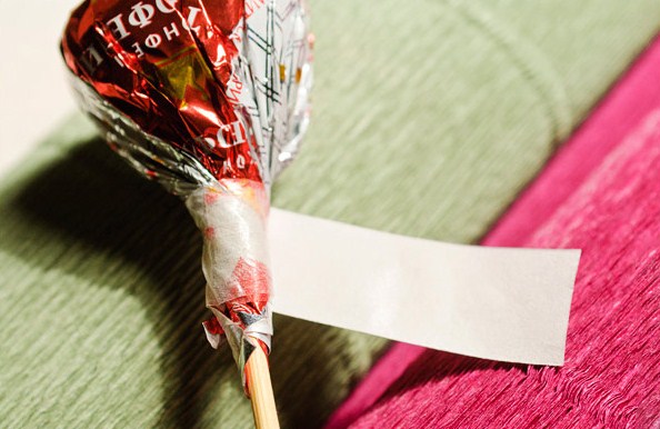 Para prender a flor ao cabo, você só precisa enrolar a ponta da embalagem de doces no palito com fita adesiva ou fita adesiva e colocar a junta com papel. O equilíbrio na composição do doce buquê é a base da beleza na preparação da decoração complexa.
