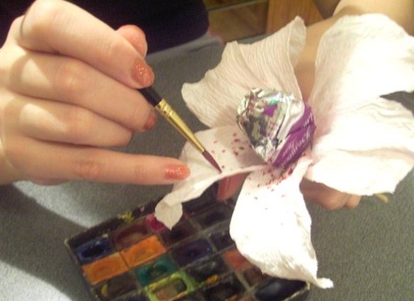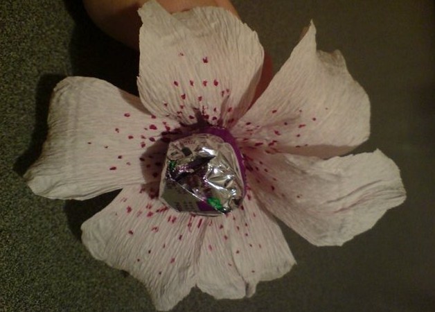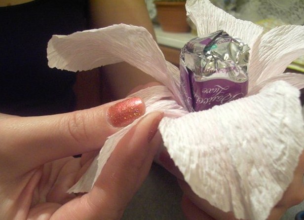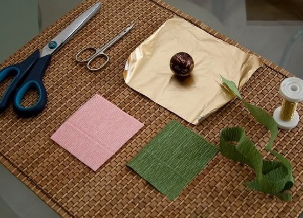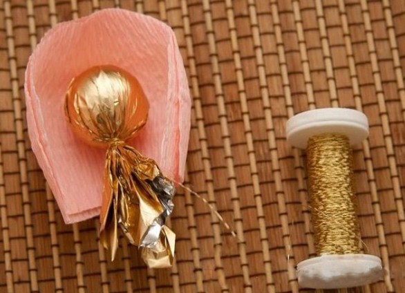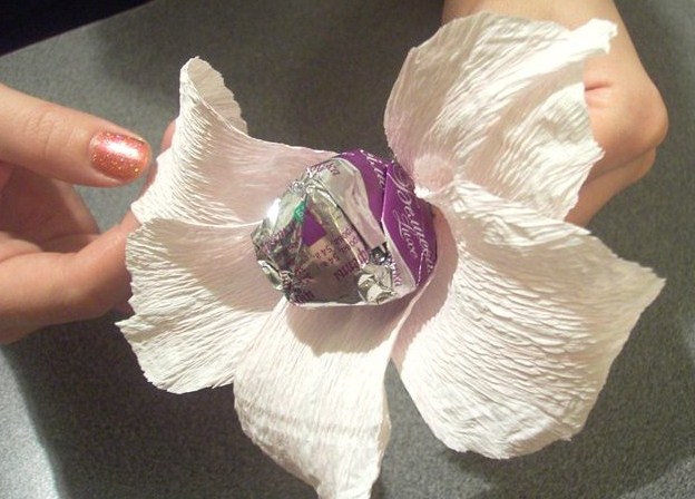- Doces em invólucros brilhantes podem desempenhar o papel das pétalas inferiores de uma flor de papel.