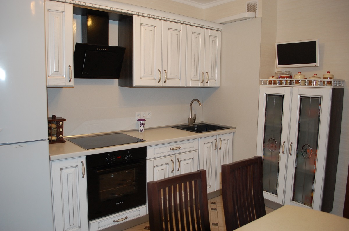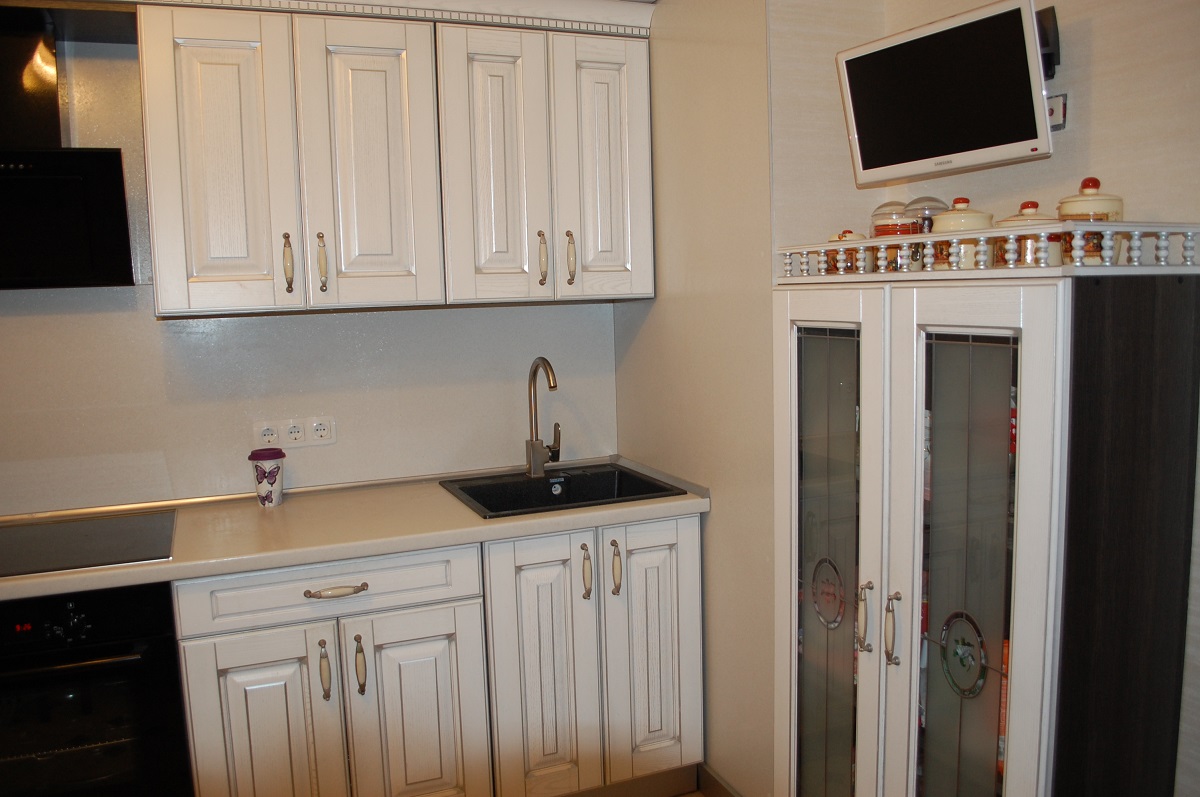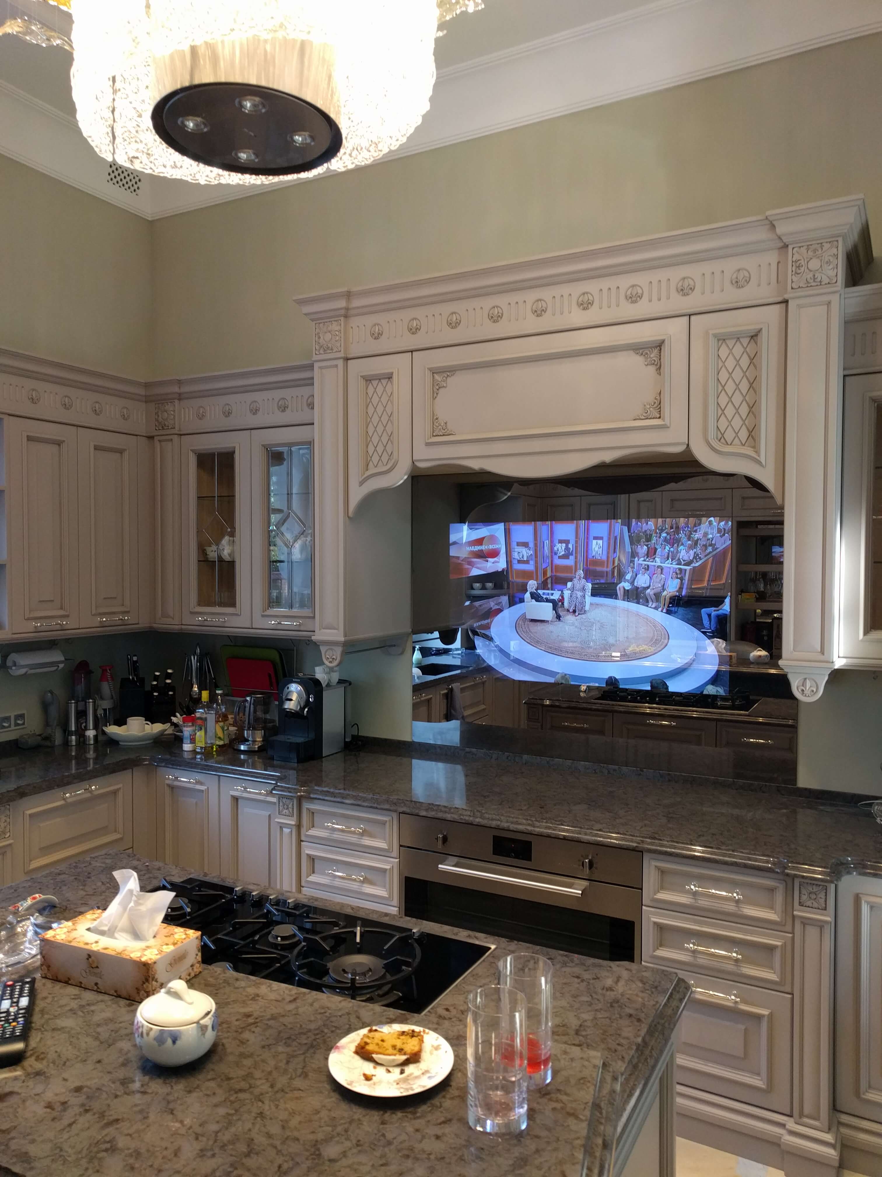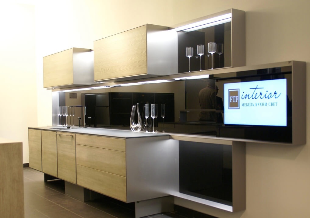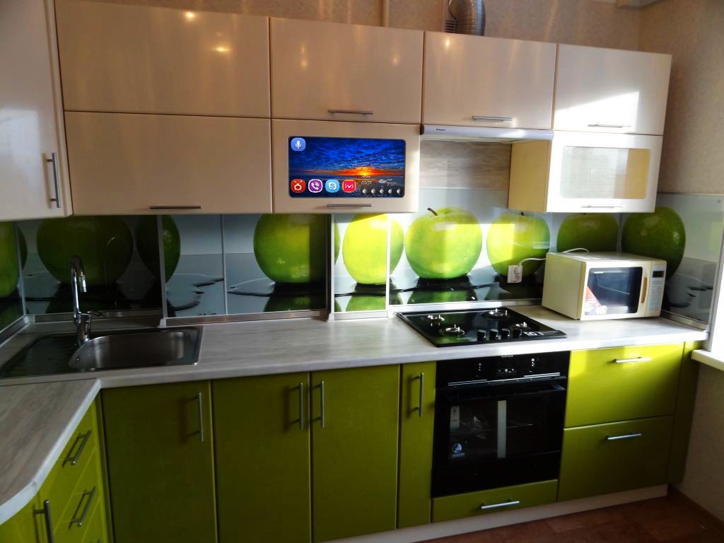 A escolha da altura também é importante, a parte superior do veículo deve estar ao nível dos olhos.. Se o espectador principal é a anfitriã que prepara a comida em pé, a tela deve ser colocada mais alta. Se for incluído apenas durante o almoço e jantar, quando toda a família se senta à mesa - abaixo.