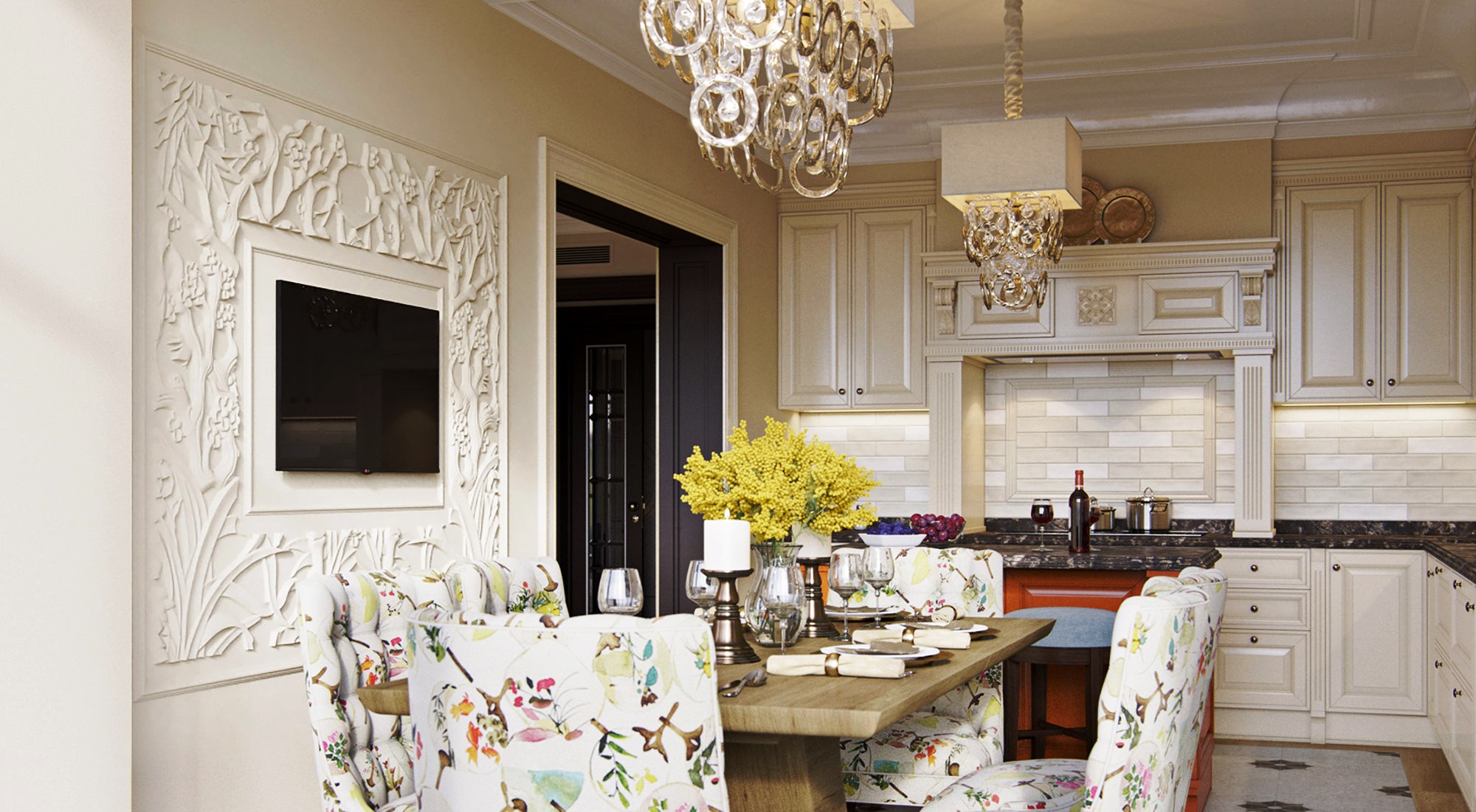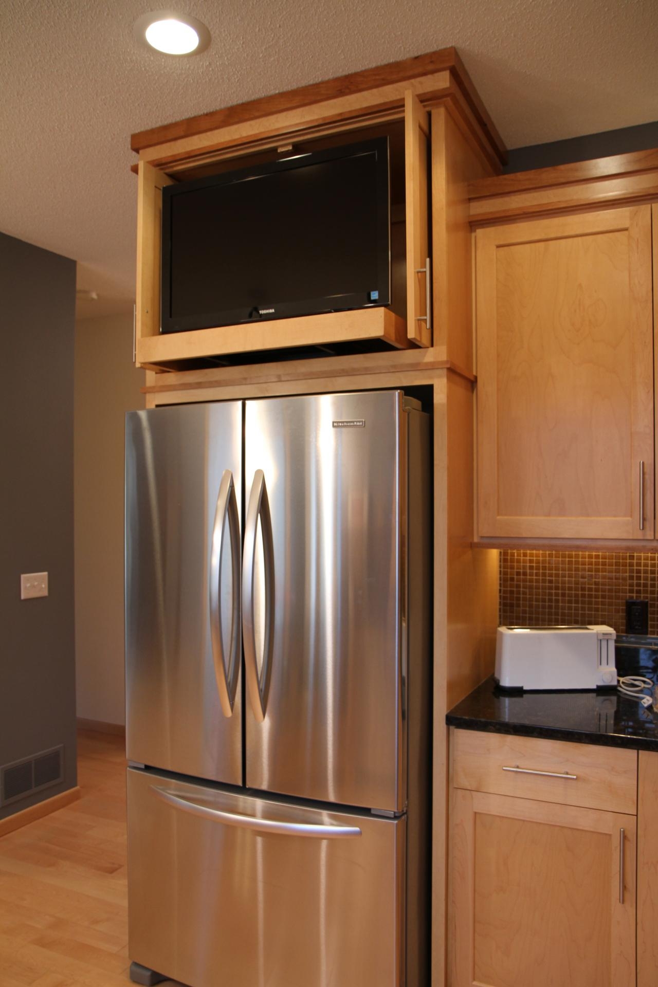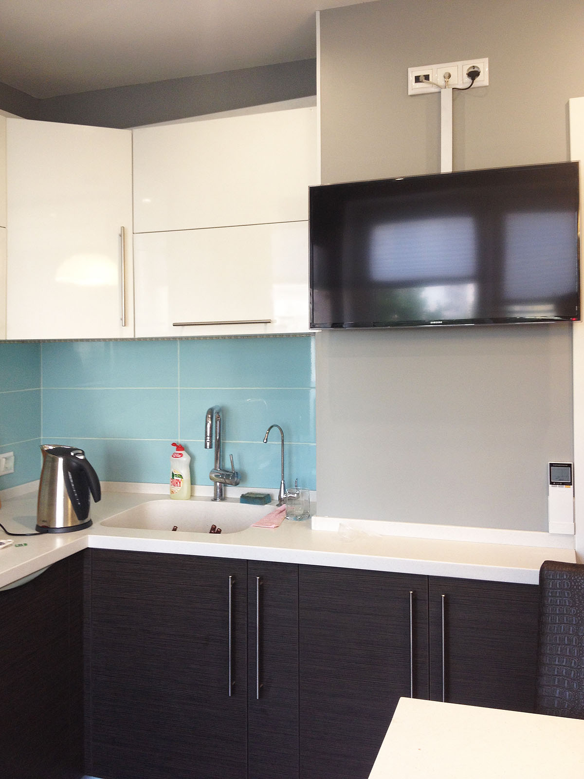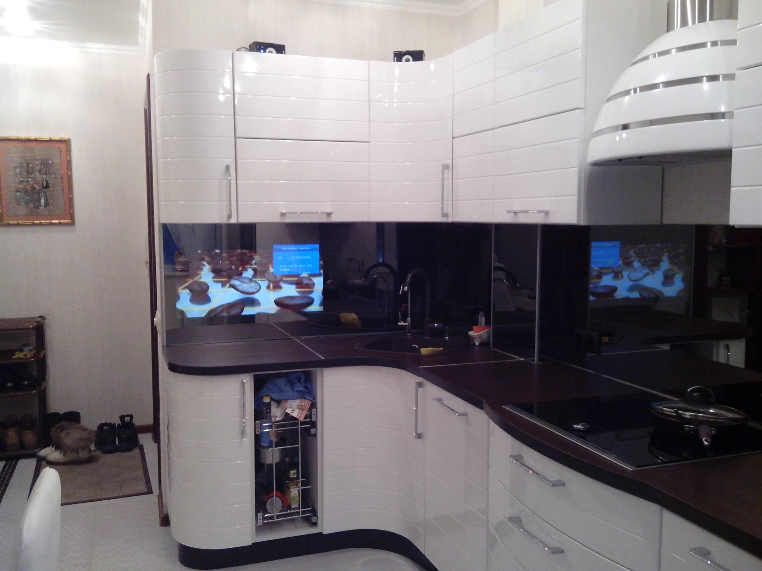 A escolha da altura também é importante, a parte superior do veículo deve estar ao nível dos olhos.. Se o espectador principal é a anfitriã que prepara a comida em pé, a tela deve ser colocada mais alta. Se for incluído apenas durante o almoço e jantar, quando toda a família se senta à mesa - abaixo.
