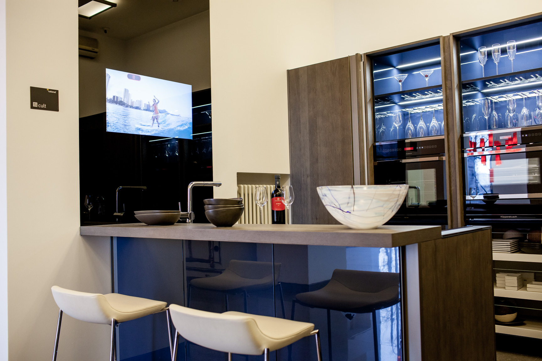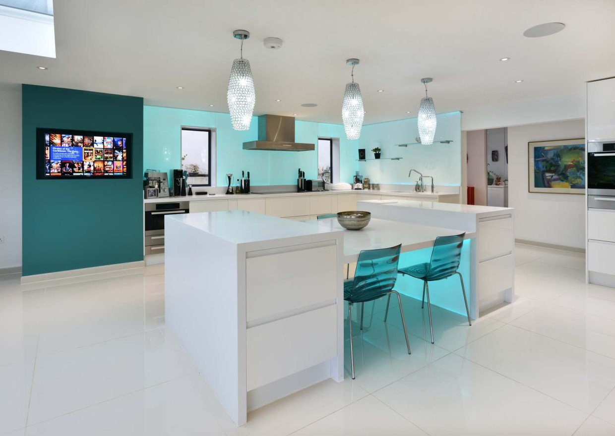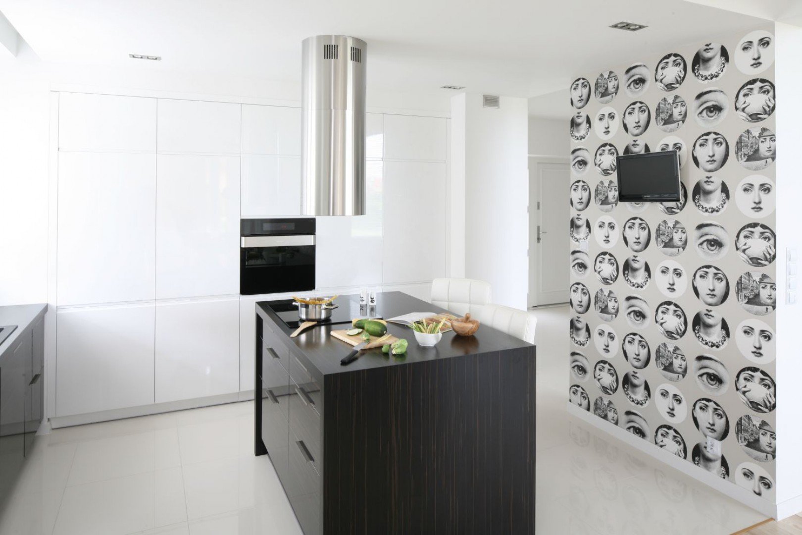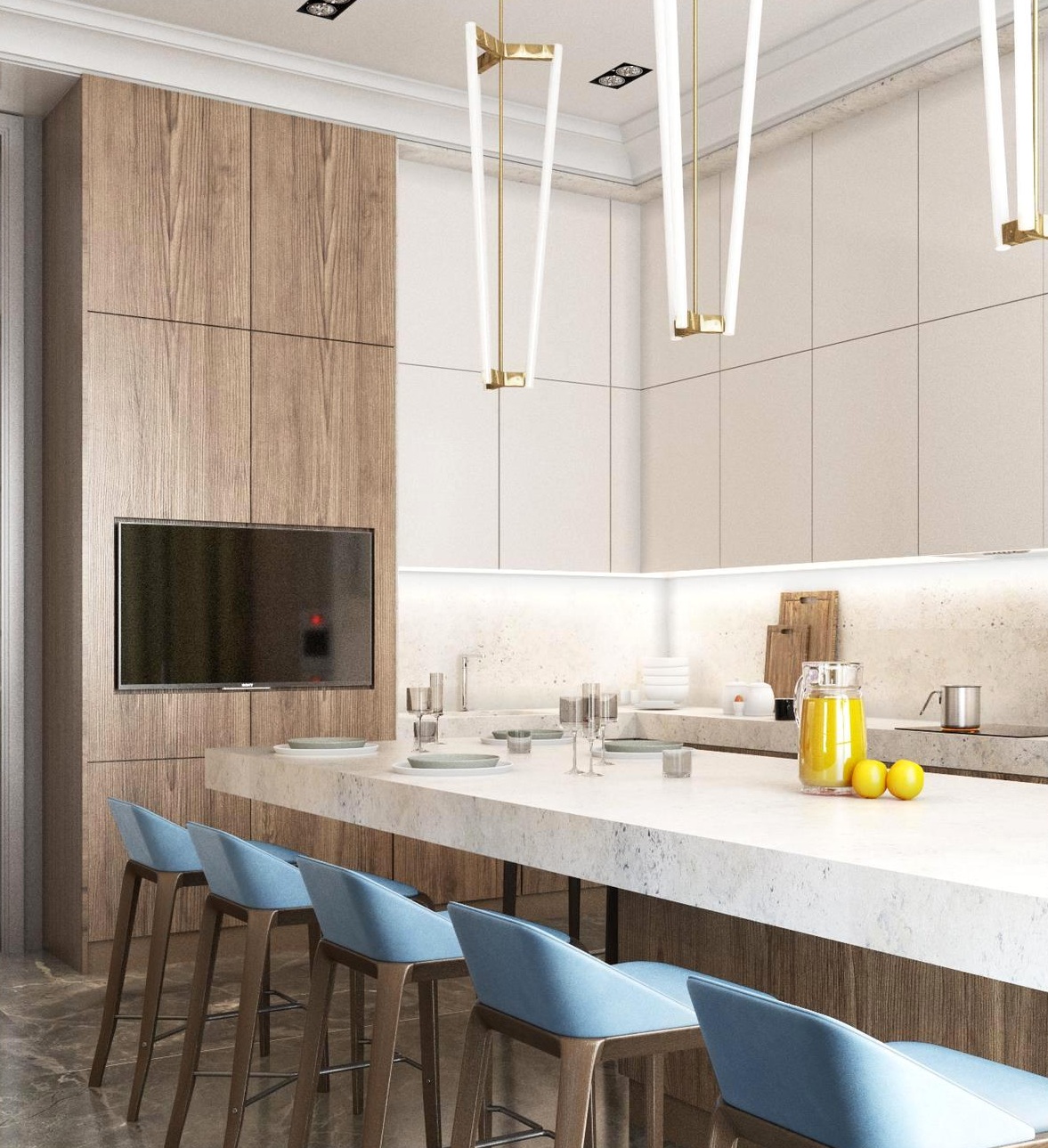 A escolha da altura também é importante, a parte superior do veículo deve estar ao nível dos olhos.. Se o espectador principal é a anfitriã que prepara a comida em pé, a tela deve ser colocada mais alta. Se for incluído apenas durante o almoço e jantar, quando toda a família se senta à mesa - abaixo.