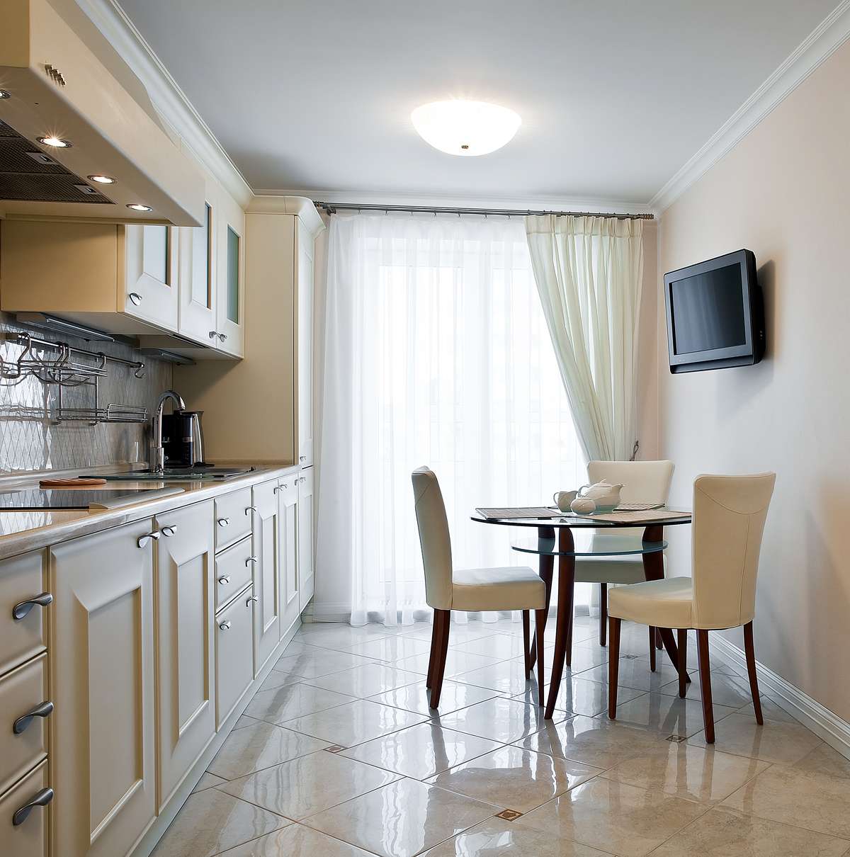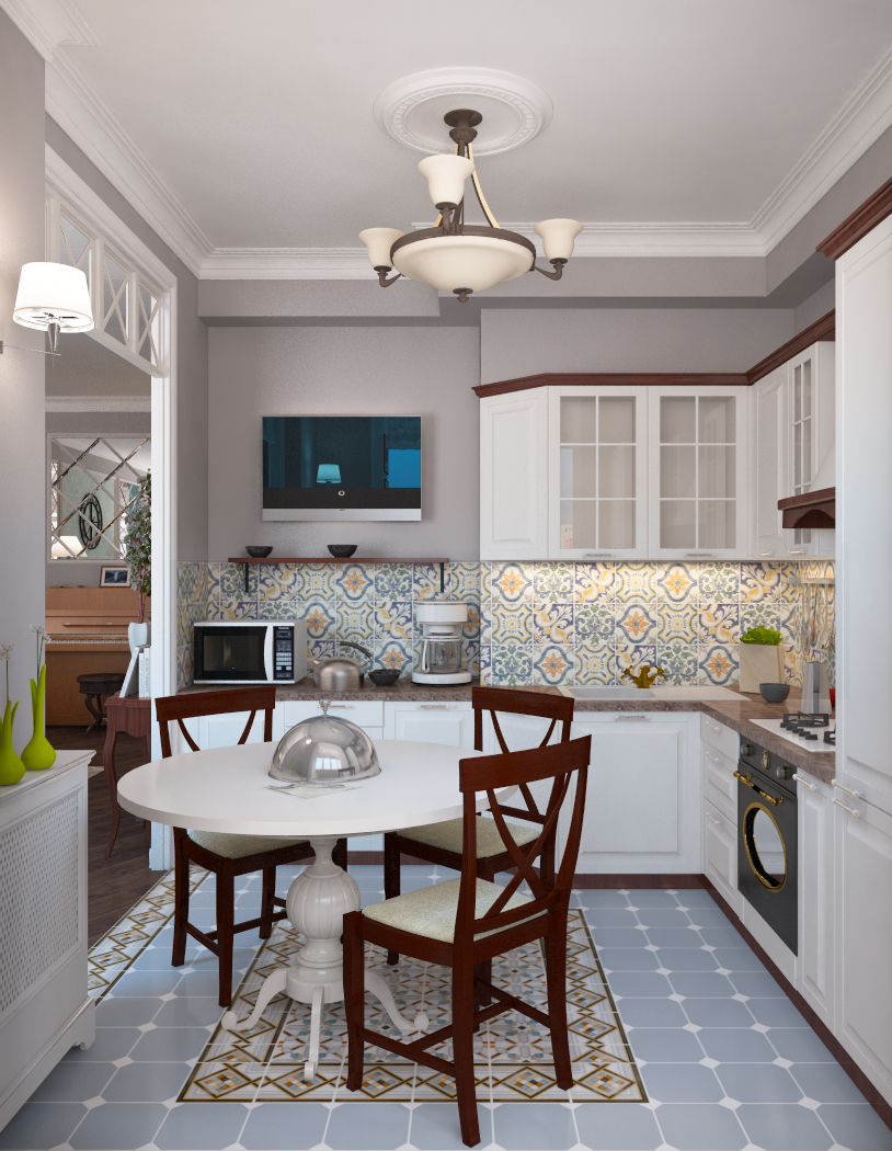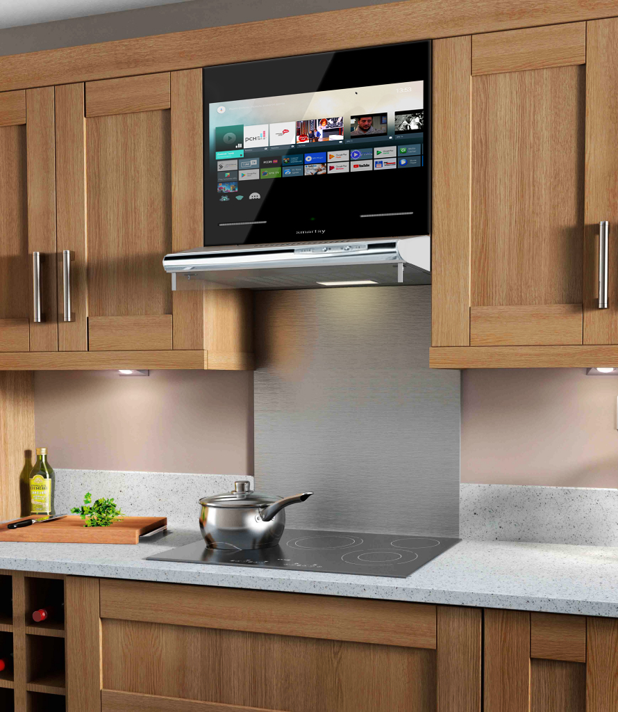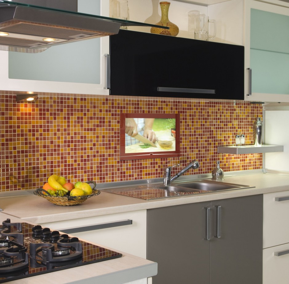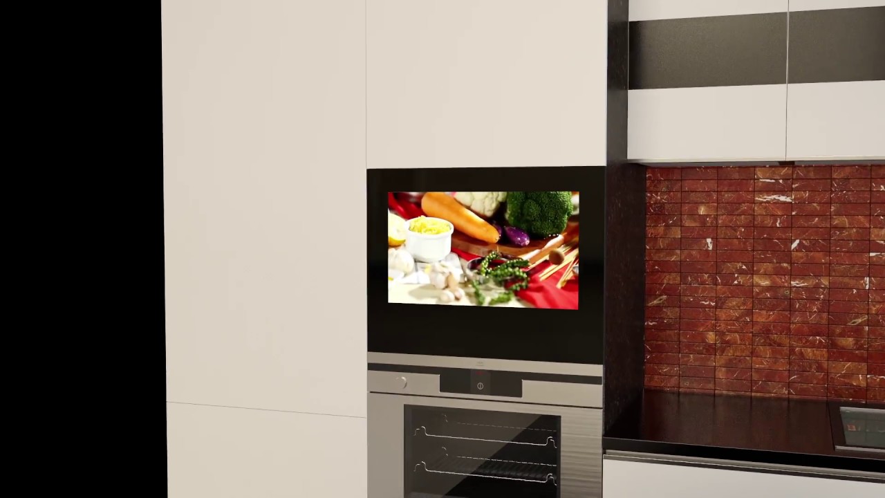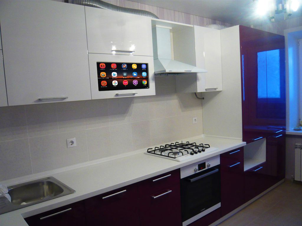 Não faz sentido instalar modelos pequenos, porque não apenas a anfitriã, mas também todos os membros da família que vieram comer vão querer assistir ao filme. Portanto, recomenda-se colocar a tela de modo que ela possa ser vista por todos a partir de diferentes ângulos de uma grande cozinha. Para fazer isso, use telas de 30 polegadas e mais.