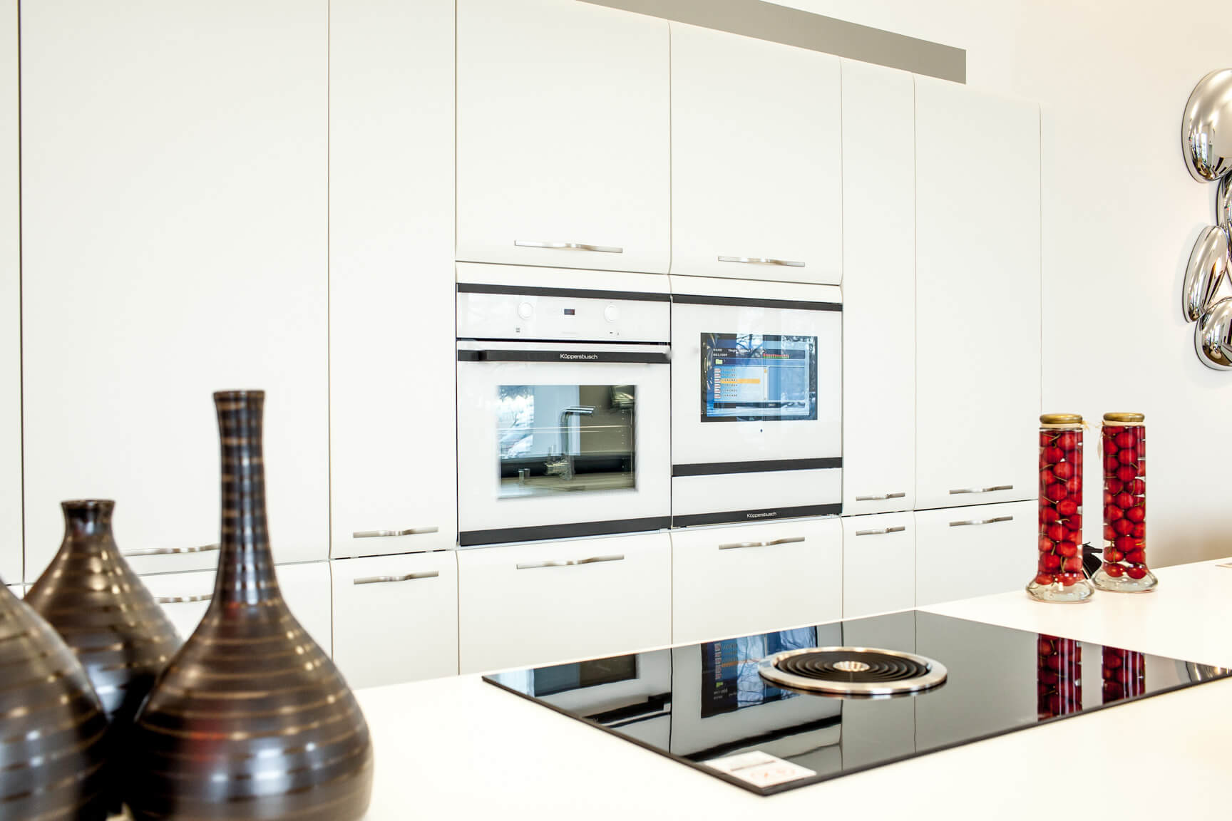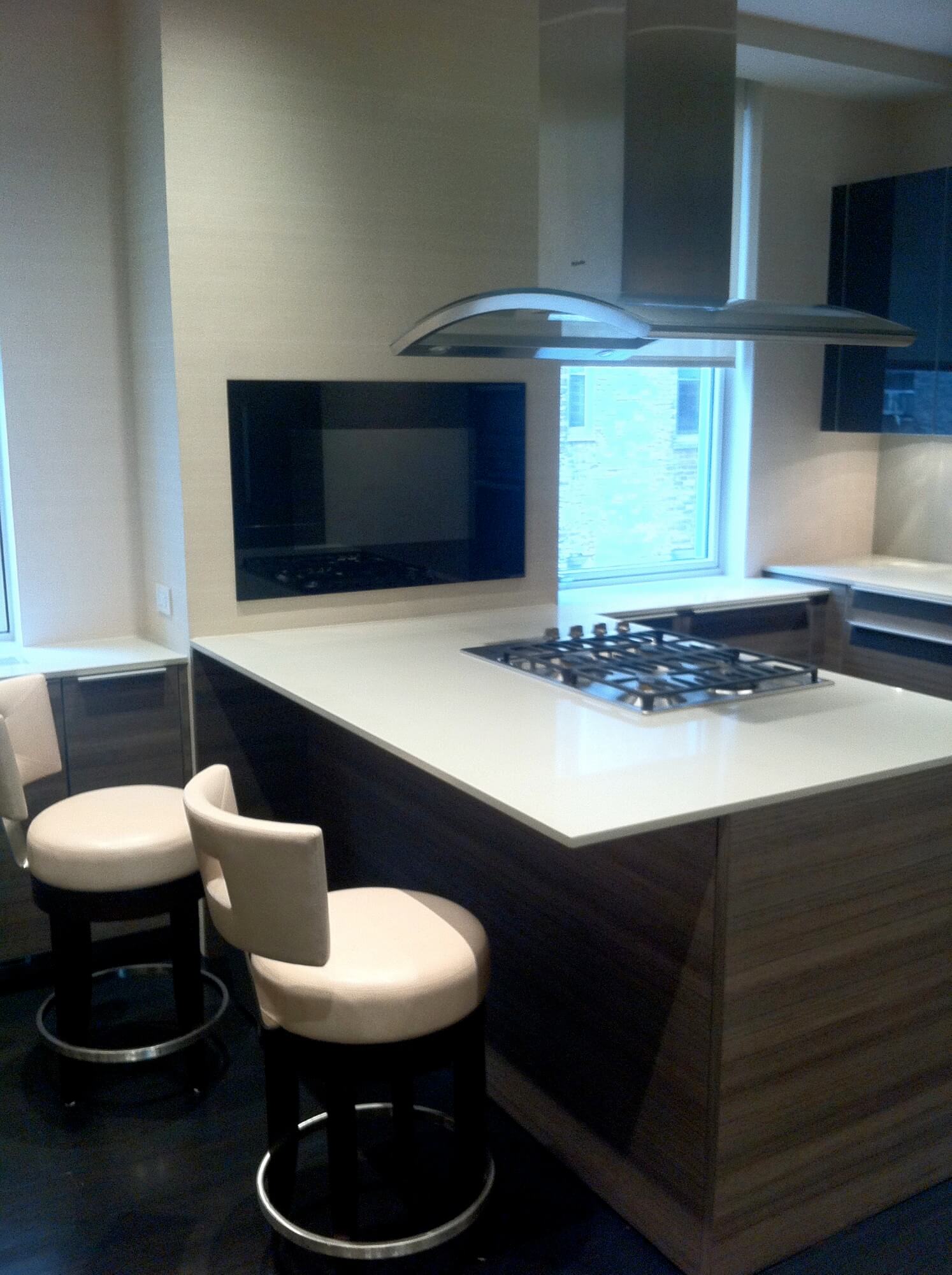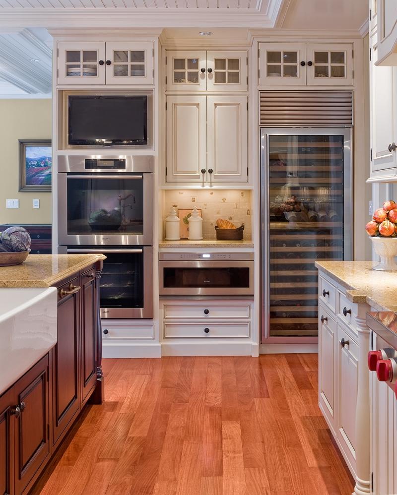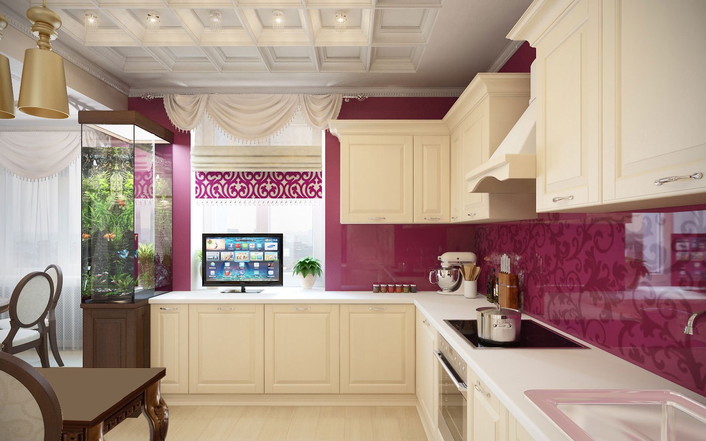 Não faz sentido instalar modelos pequenos, porque não apenas a anfitriã, mas também todos os membros da família que vieram comer vão querer assistir ao filme. Portanto, recomenda-se colocar a tela de modo que ela possa ser vista por todos a partir de diferentes ângulos de uma grande cozinha. Para fazer isso, use telas de 30 polegadas e mais.