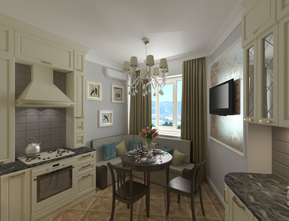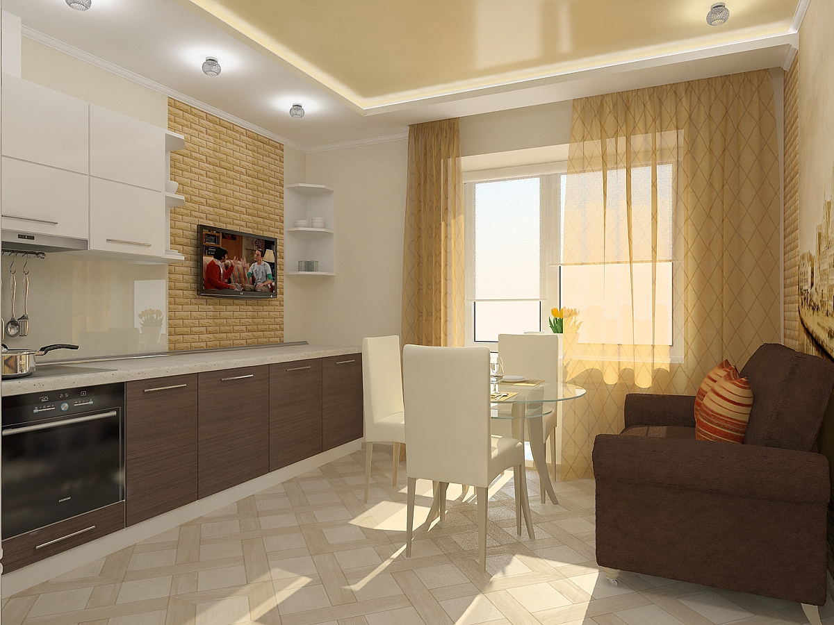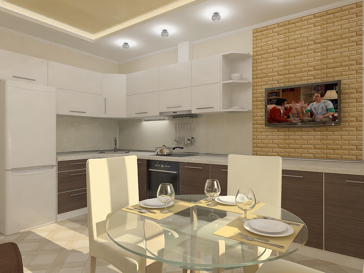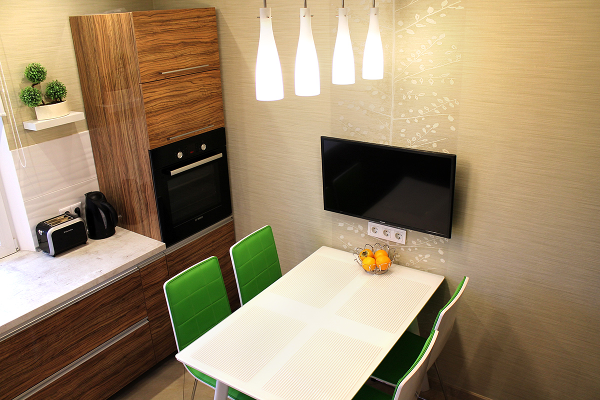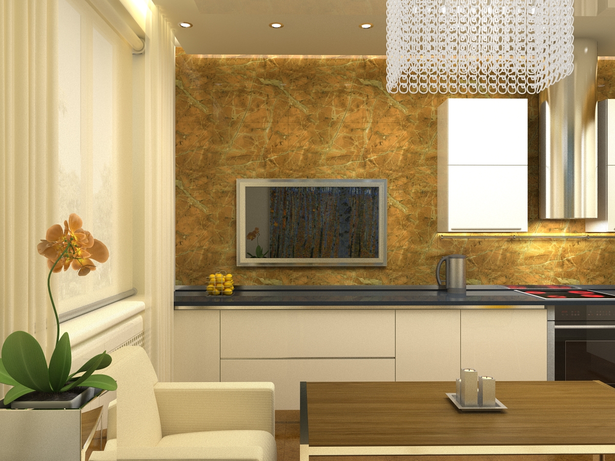 A maioria das opções de design envolve a localização do sofá em frente à superfície de trabalho. Entre eles é a mesacadeiras É melhor pendurar a tela na parede lateral para que ela possa ser vista com igual clareza por aqueles que estão deitados e a anfitriã parada no fogão. Quando os convidados se sentarem à mesa, basta deixar uma das pequenas festas mais próximas da tela, não ocupada.