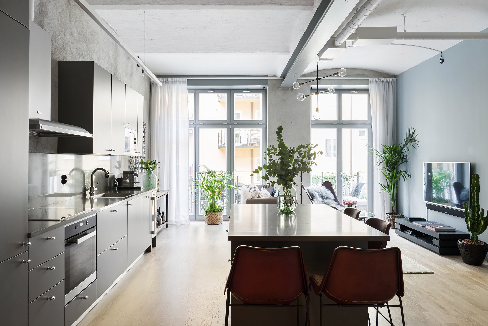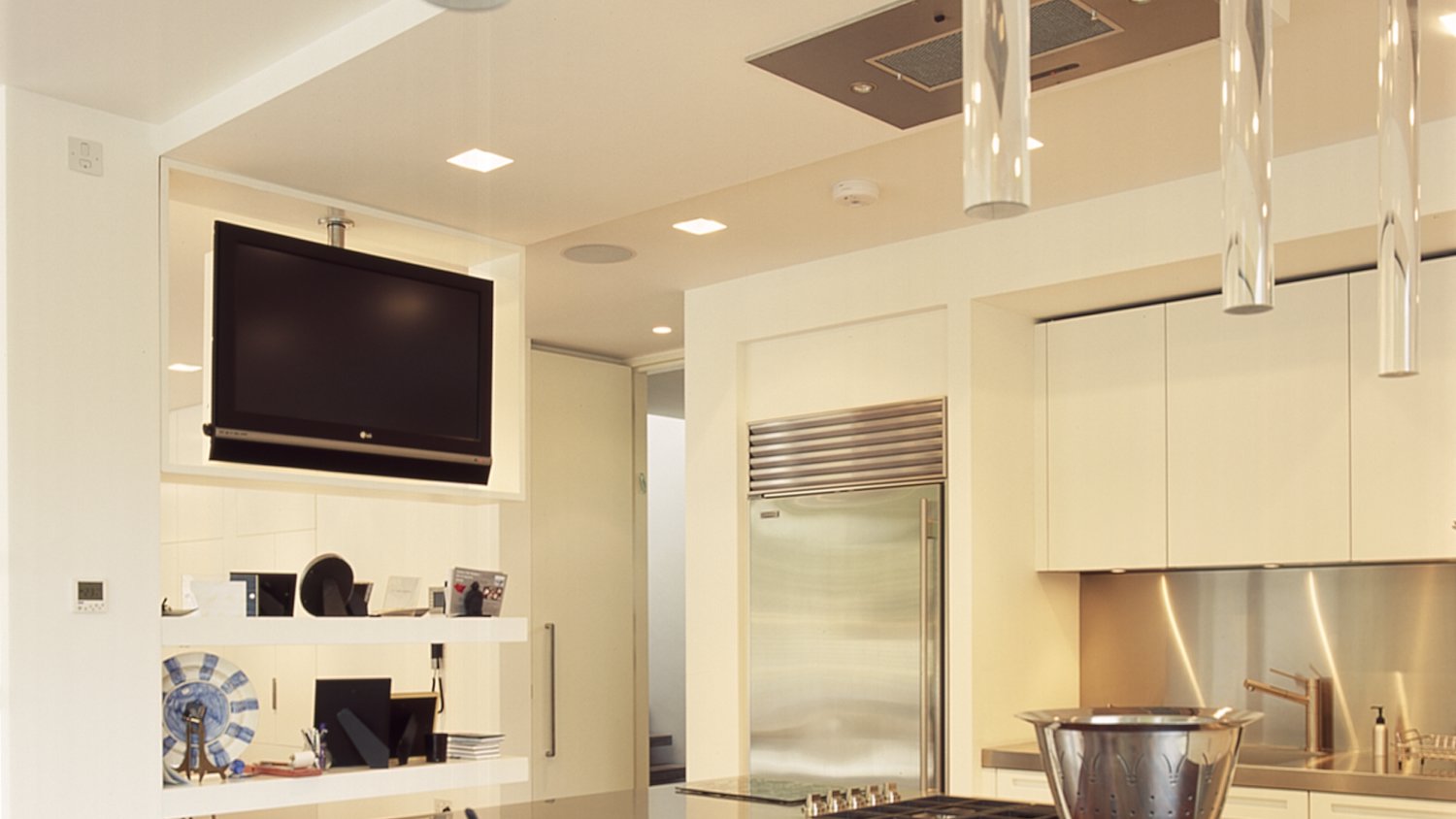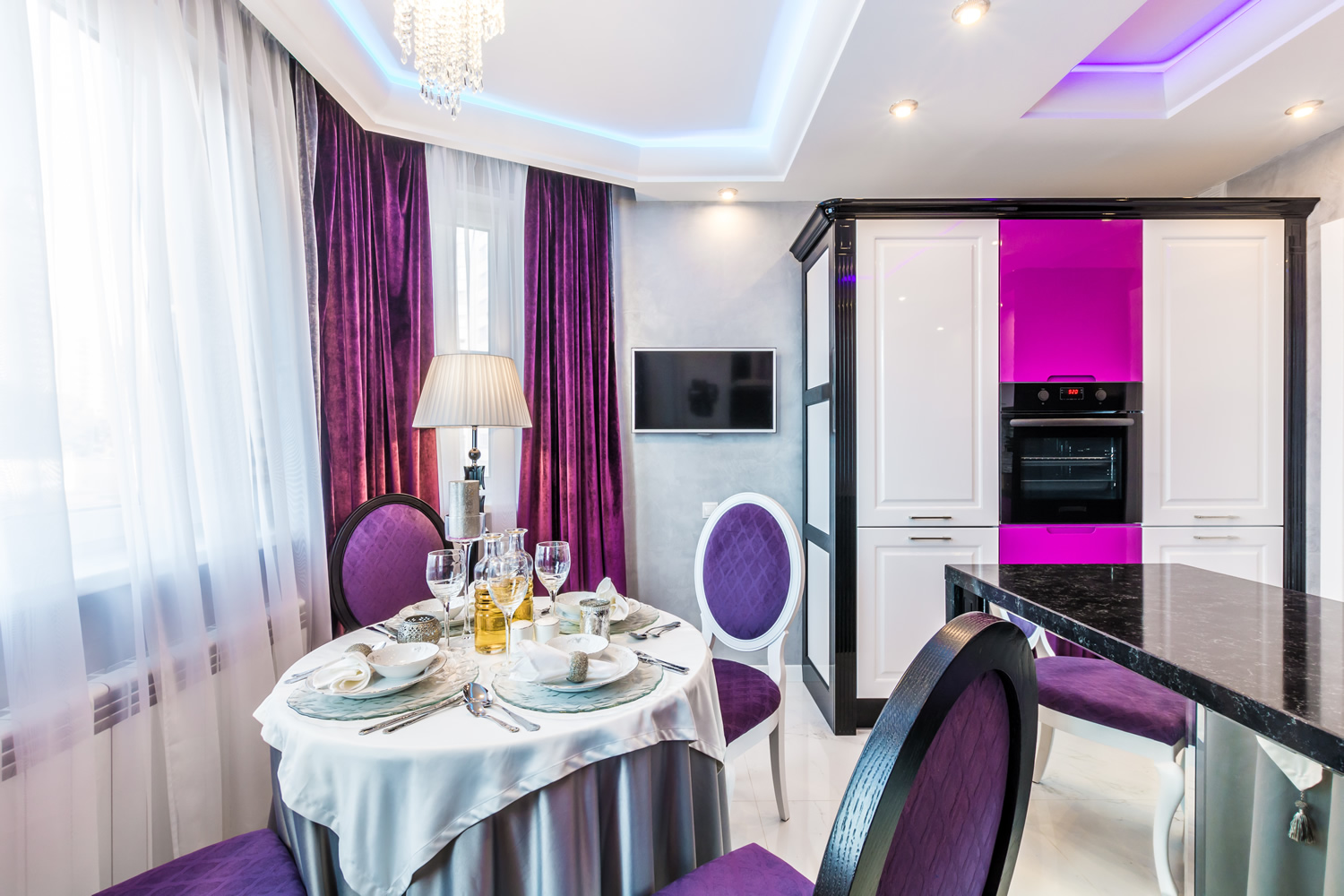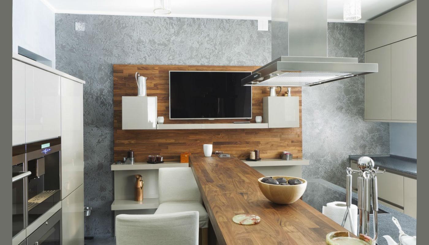 A maioria das opções de design envolve a localização do sofá em frente à superfície de trabalho. Entre eles é a mesacadeiras É melhor pendurar a tela na parede lateral para que ela possa ser vista com igual clareza por aqueles que estão deitados e a anfitriã parada no fogão. Quando os convidados se sentarem à mesa, basta deixar uma das pequenas festas mais próximas da tela, não ocupada.