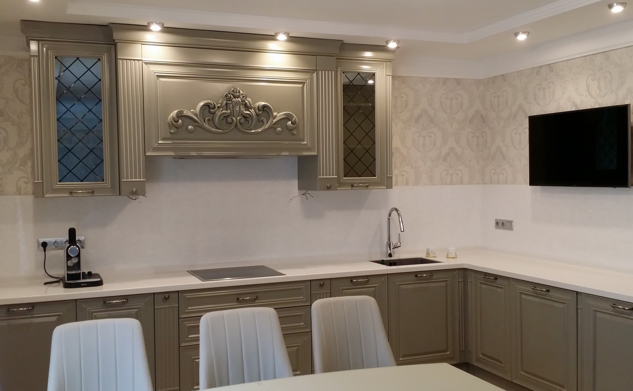 Esta opção é adequada para proprietários de grandes cozinhas, que não precisam economizar espaço. Isso se aplica a moradores de novos edifícios, nos quais o tamanho da sala para cozinhar é geralmente impressionante. Eles combinam duas partes: