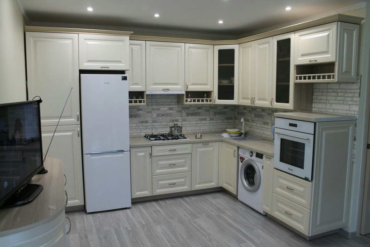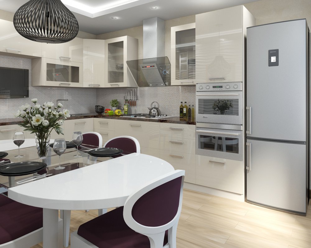 Cozinha em forma de L - uma opção freqüente usada em casas e apartamentos de diferentes layouts. A mobília é disposta de tal forma que tudo é compacto, mesmo em uma pequena sala há espaço livre. A TV está convenientemente localizada no canto oposto ao sofá em forma de L, se disponível.