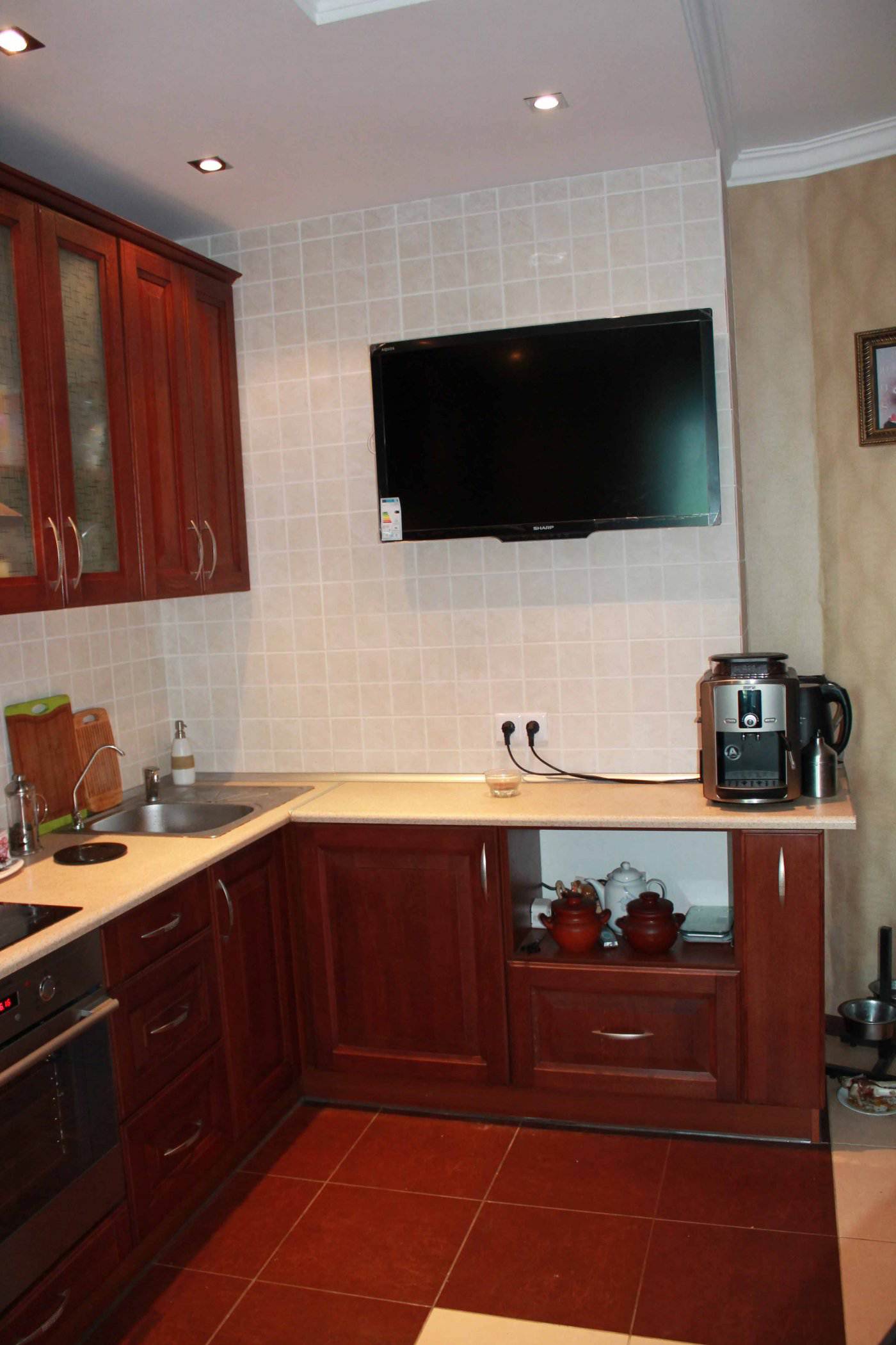O tamanho desempenha um papel importante ao escolher uma TV para cozinhasporque muitos são forçados a abandonar seus planos originais. Se não couber, deve ser abandonado. Especialistas alertam que a instalação de uma TV grande em uma sala pequena é perigosa para a visão.
