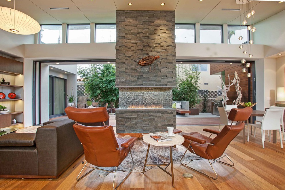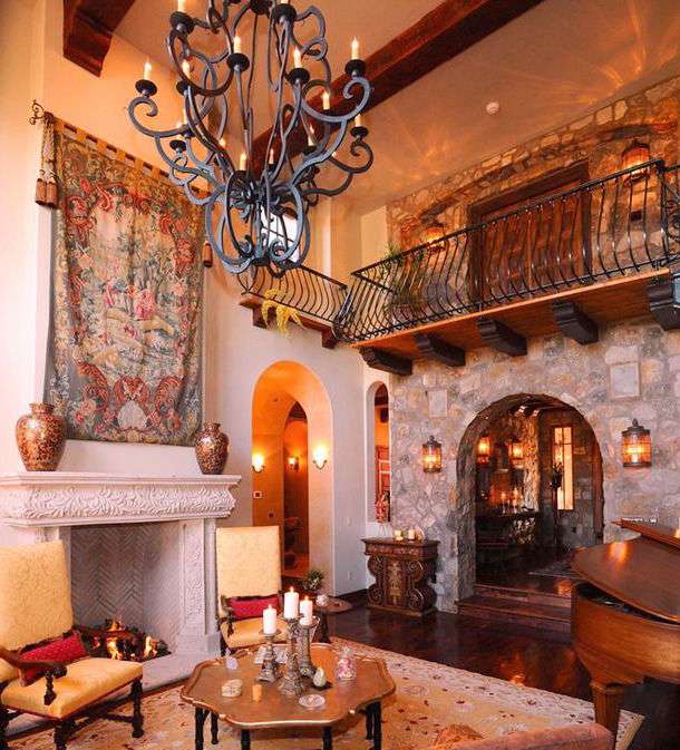 Juntamente com paredes brancas, interiores em casas inspiradas pelos espanhóis quase sempre têm telhas de barro como revestimentos de piso e acabamentos, e às vezes azulejos decorativos elegantes, especialmente na cozinha e banho. UmDetalhes arquitetônicos, como grades e grades, geralmente consistem em ferro forjado ou produtos de madeira lindamente esculpidos em salas mais altas.