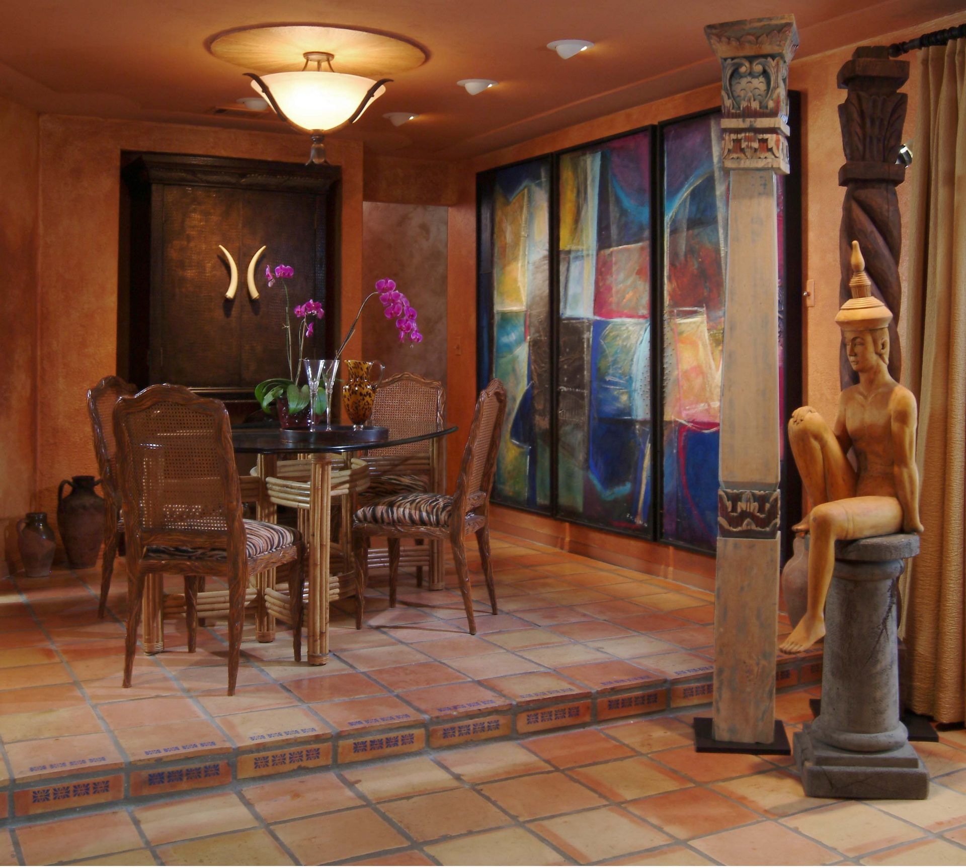 Os espanhóis foram os primeiros europeus que se estabeleceram com sucesso no sudoeste americano, o que torna o estilo espanhol extremamente influente na região até hoje. Casas tradicionais de estilo espanhol ainda estão sendo construídas na área.Este look realça a cor laranja de terracota com paredes de gesso texturizadas, com um interior, geralmente feito em gesso branco com bordas moldadas e recantos e cantos.