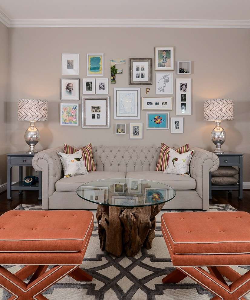 A paleta cinza e laranja também funciona em um ambiente Art Nouveau, onde as linhas minimalistas e o conceito aberto da casa permitem que você entre na cena de móveis ousados.