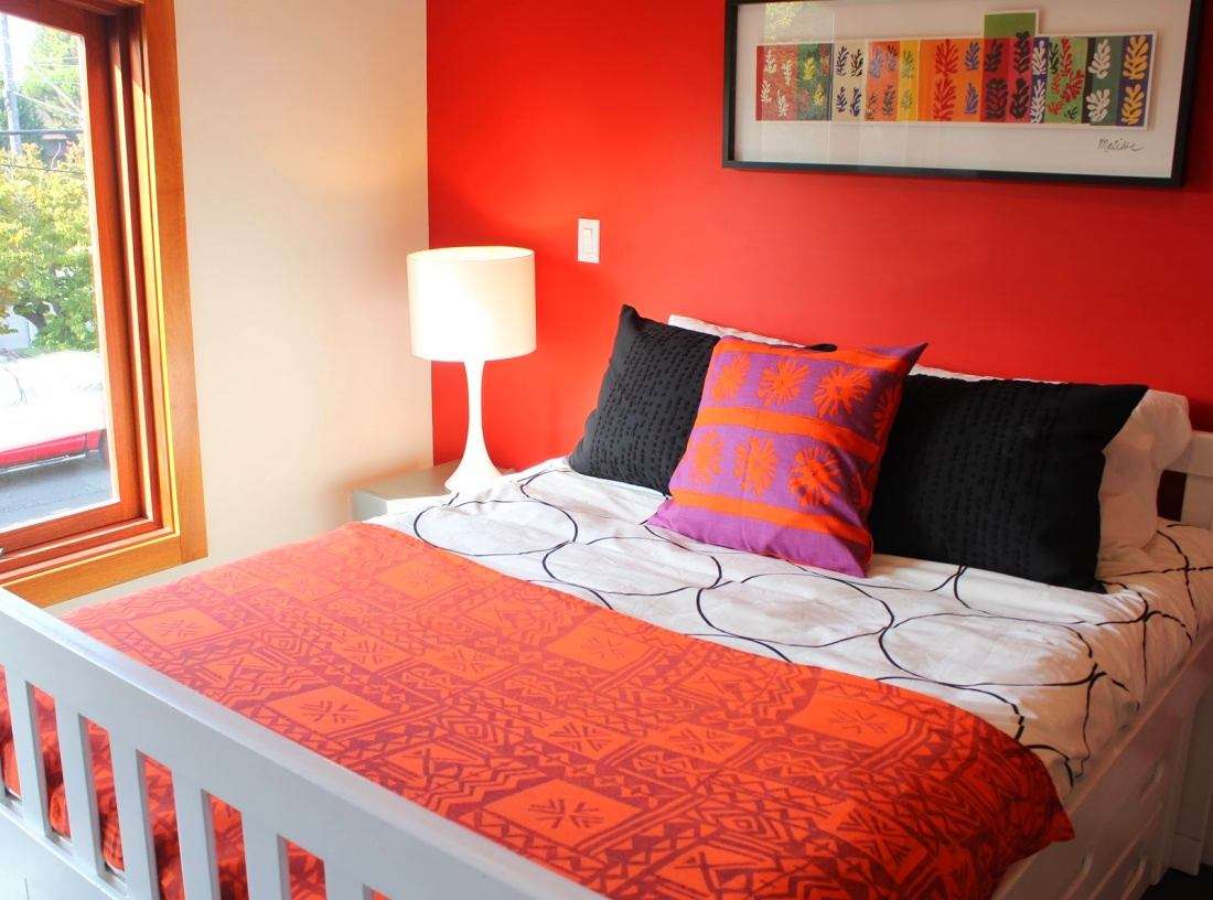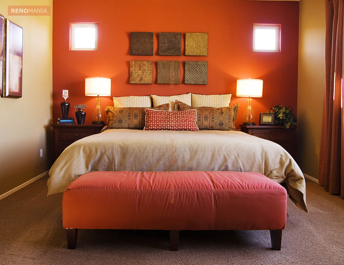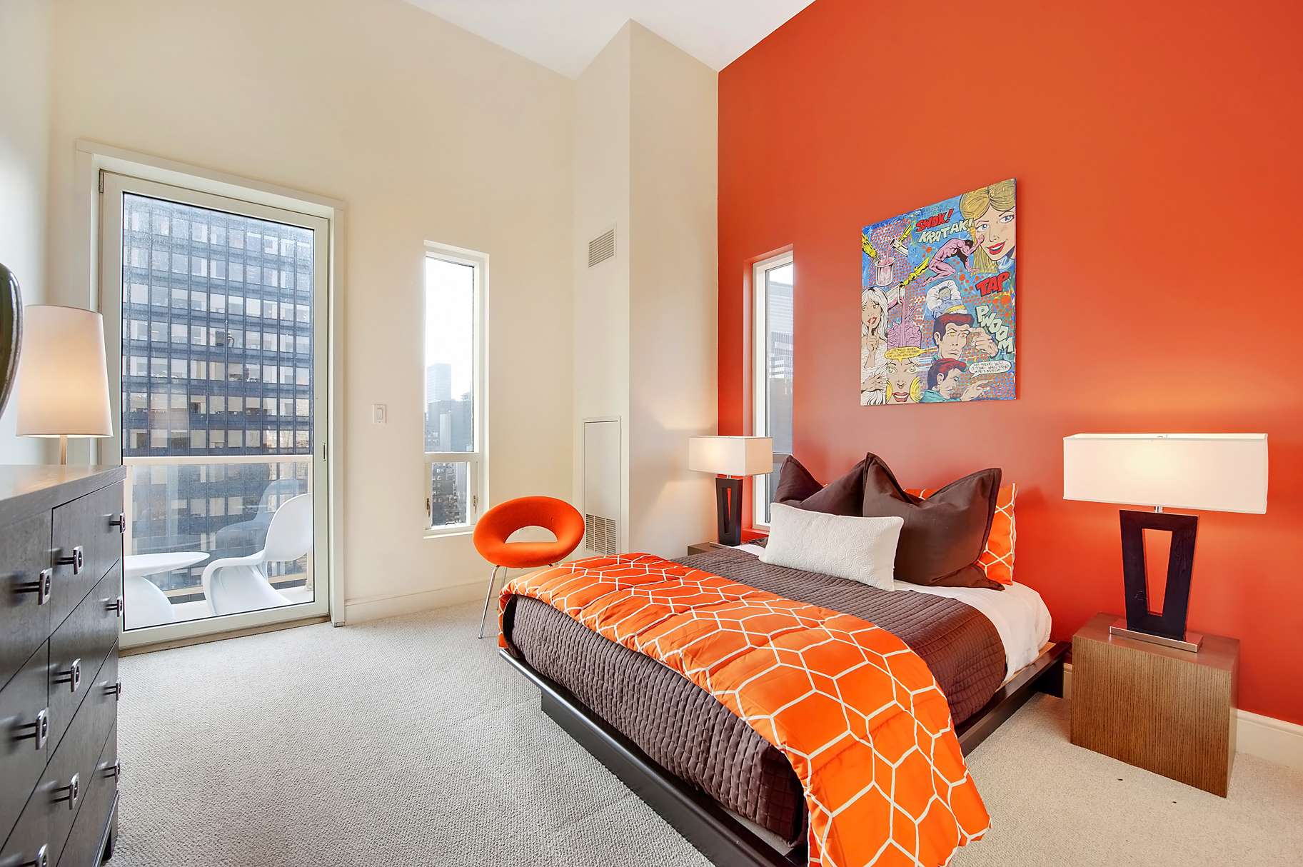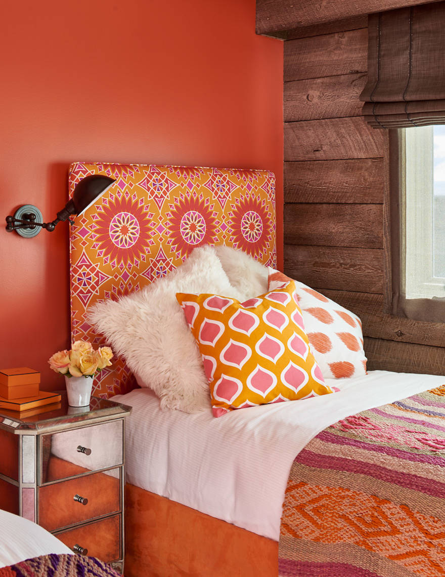 Para uma casa moderna, não tenha medo de usar tons mais saturados e energéticos de ferrugem alaranjada para adicionar interesse visual e quente no quarto. Independentemente de eles serem parte da geometria da sala, aplicada em uma parede de destaque ou em uma parte fundamental da mobília, essa sombra é uma ótima maneira de experimentar cores ricas.