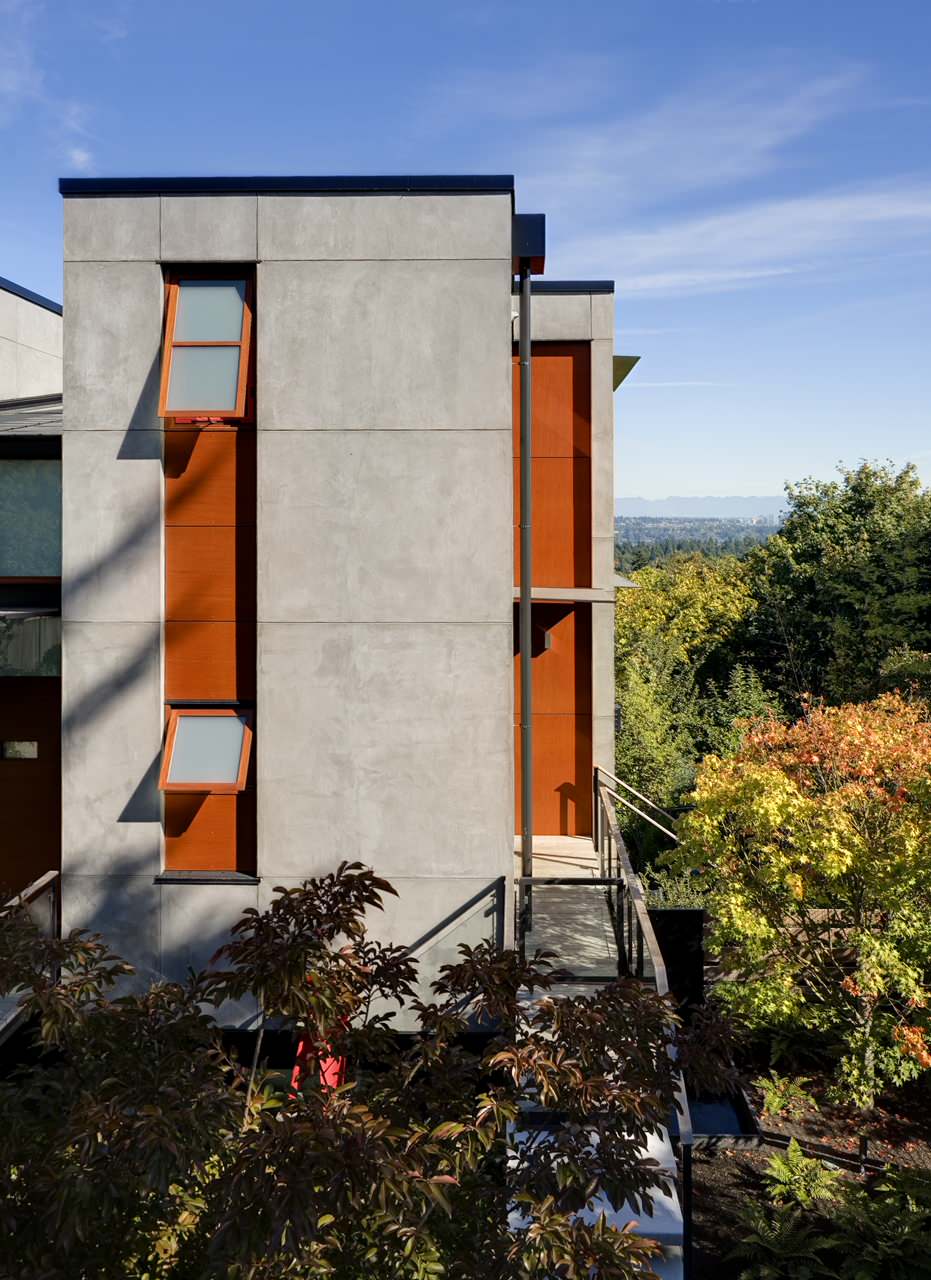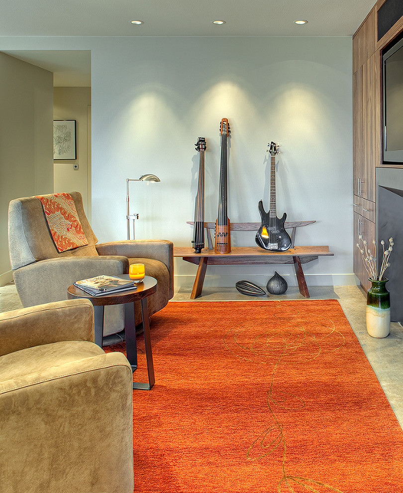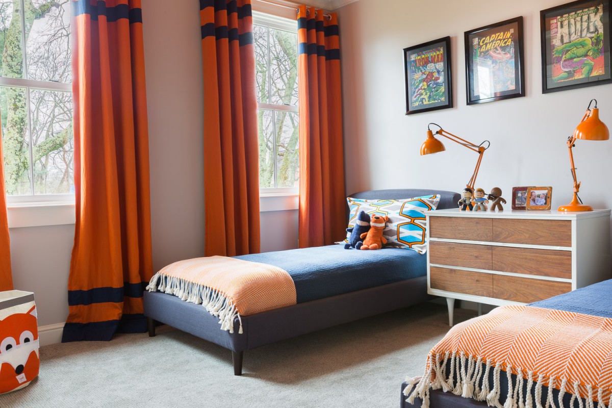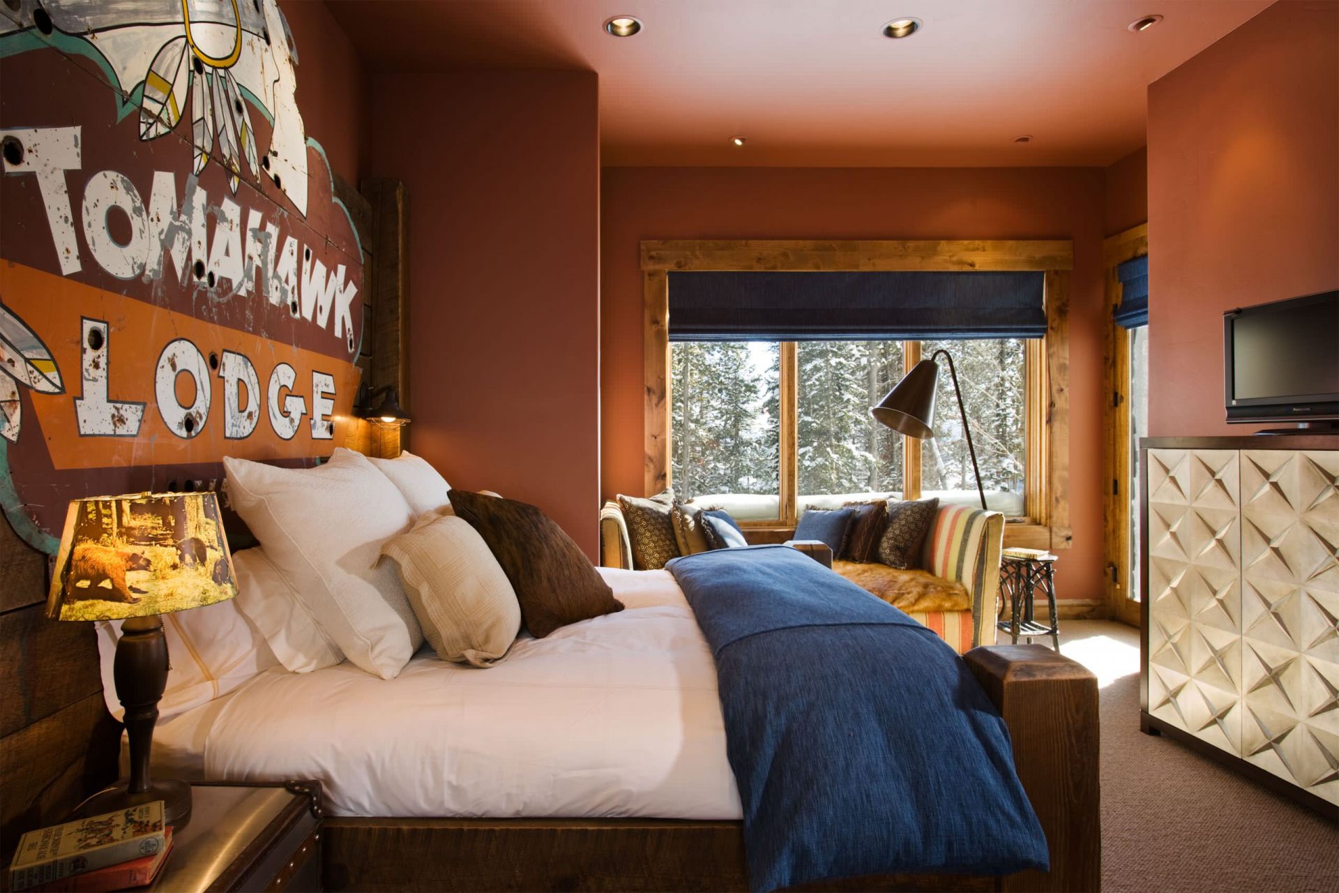 Para uma casa moderna, não tenha medo de usar tons mais saturados e energéticos de ferrugem alaranjada para adicionar interesse visual e quente no quarto. Independentemente de eles serem parte da geometria da sala, aplicada em uma parede de destaque ou em uma parte fundamental da mobília, essa sombra é uma ótima maneira de experimentar cores ricas.
