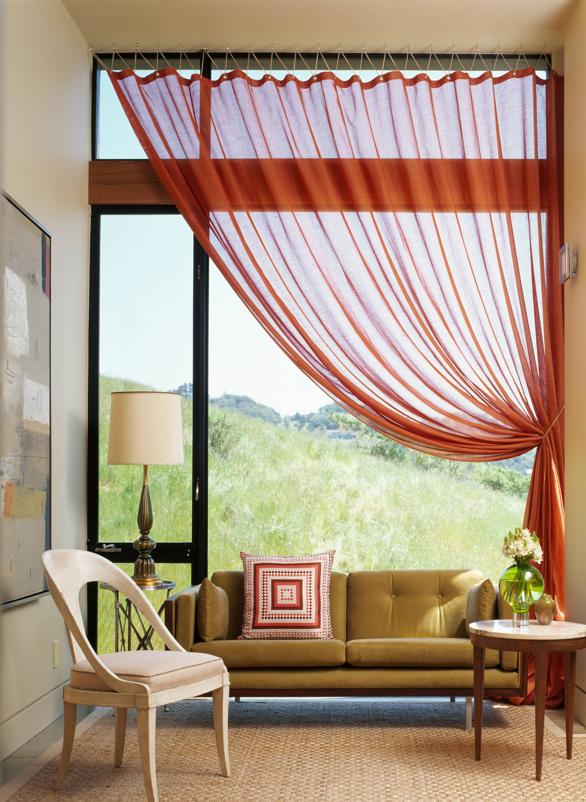 Cortinas nesta sombra são geralmente usados para criar um ponto brilhante na sala. O contraste é apropriado com bege Interior, estofado marrom escuro e decoração em madeira. Padrões para tais cortinas são aplicados com tons dourados ou amarelo claro.