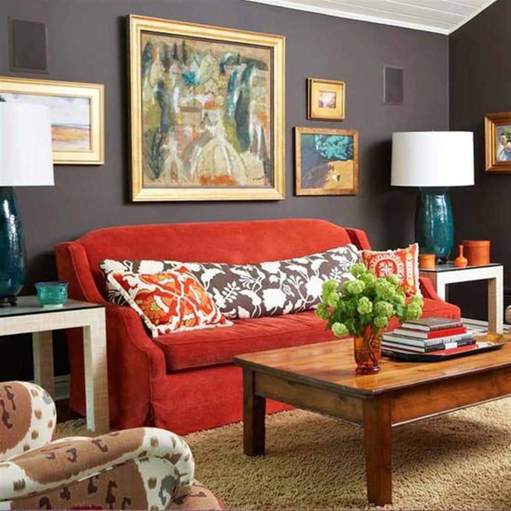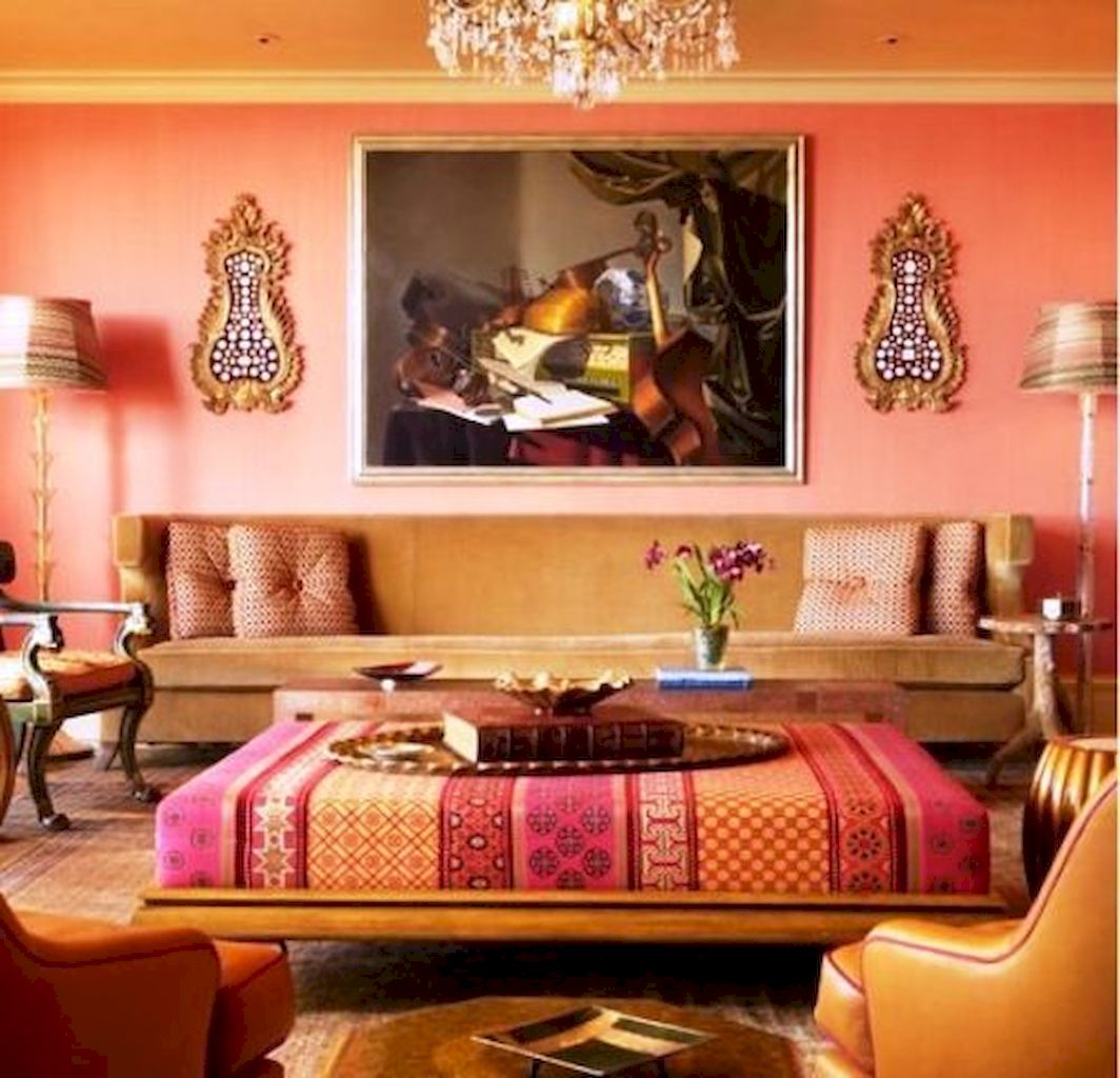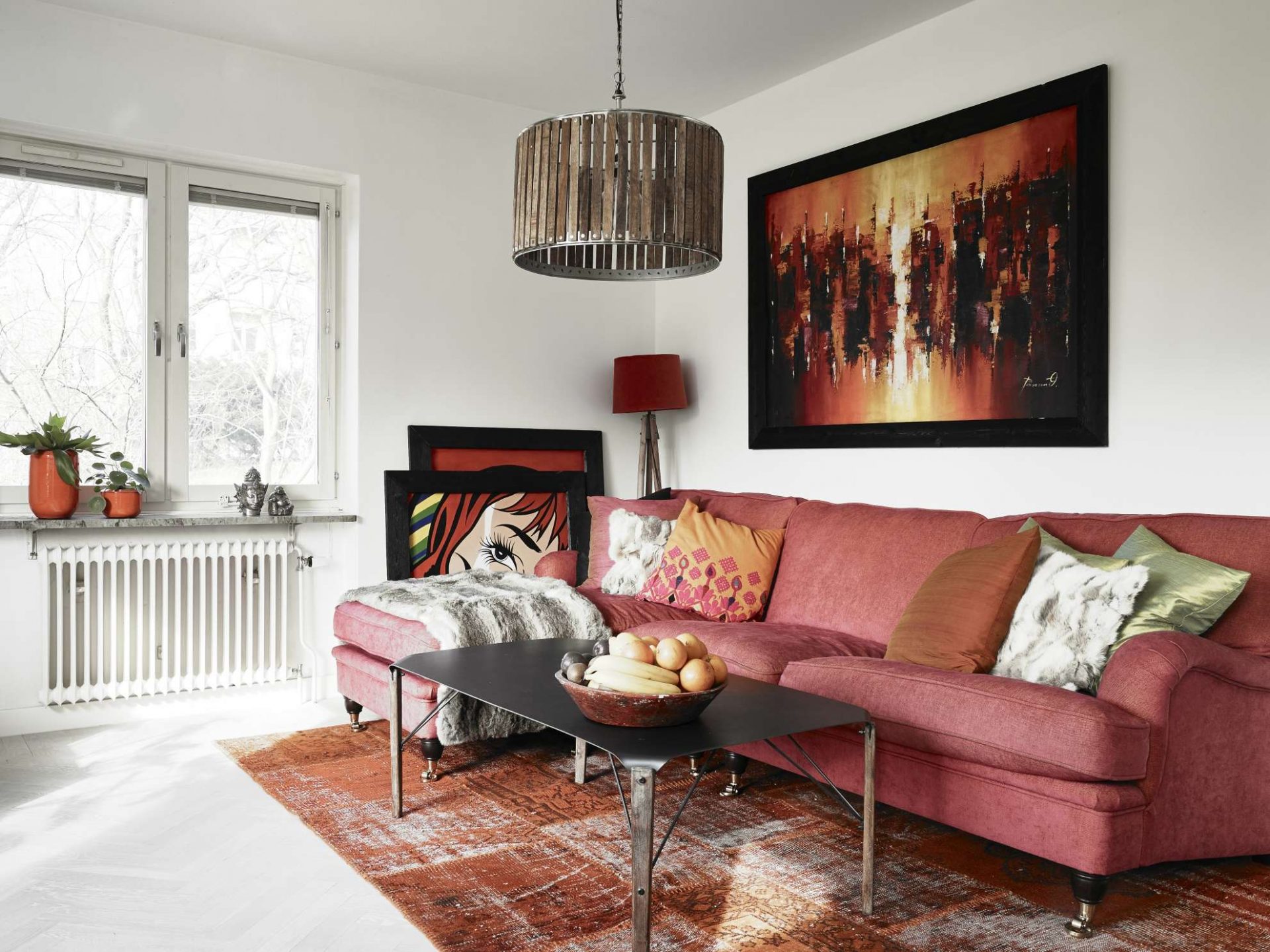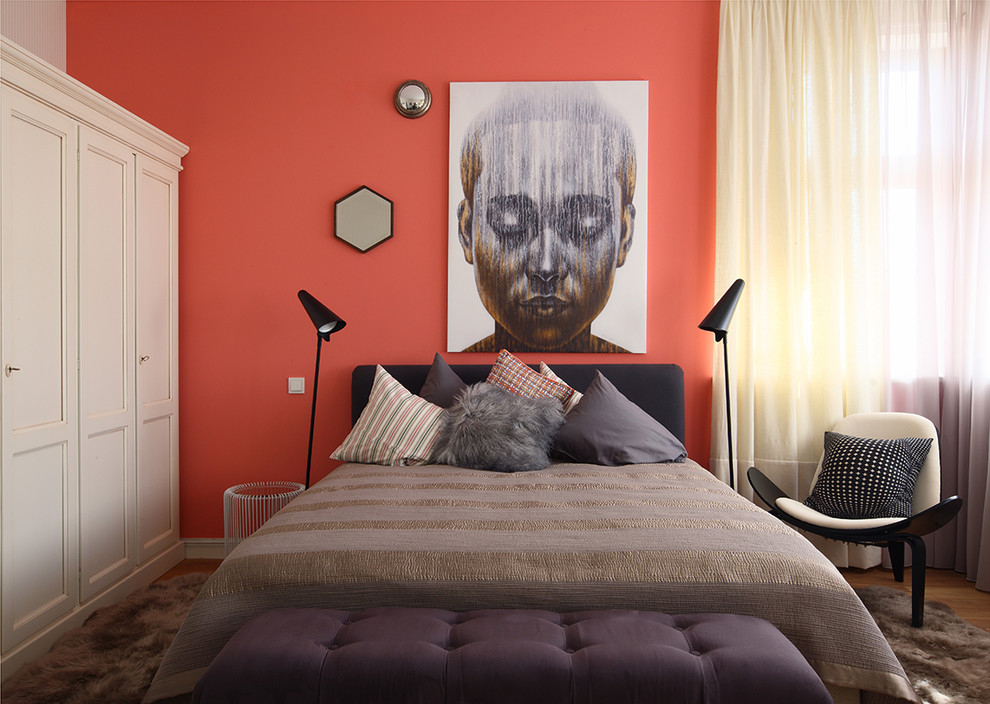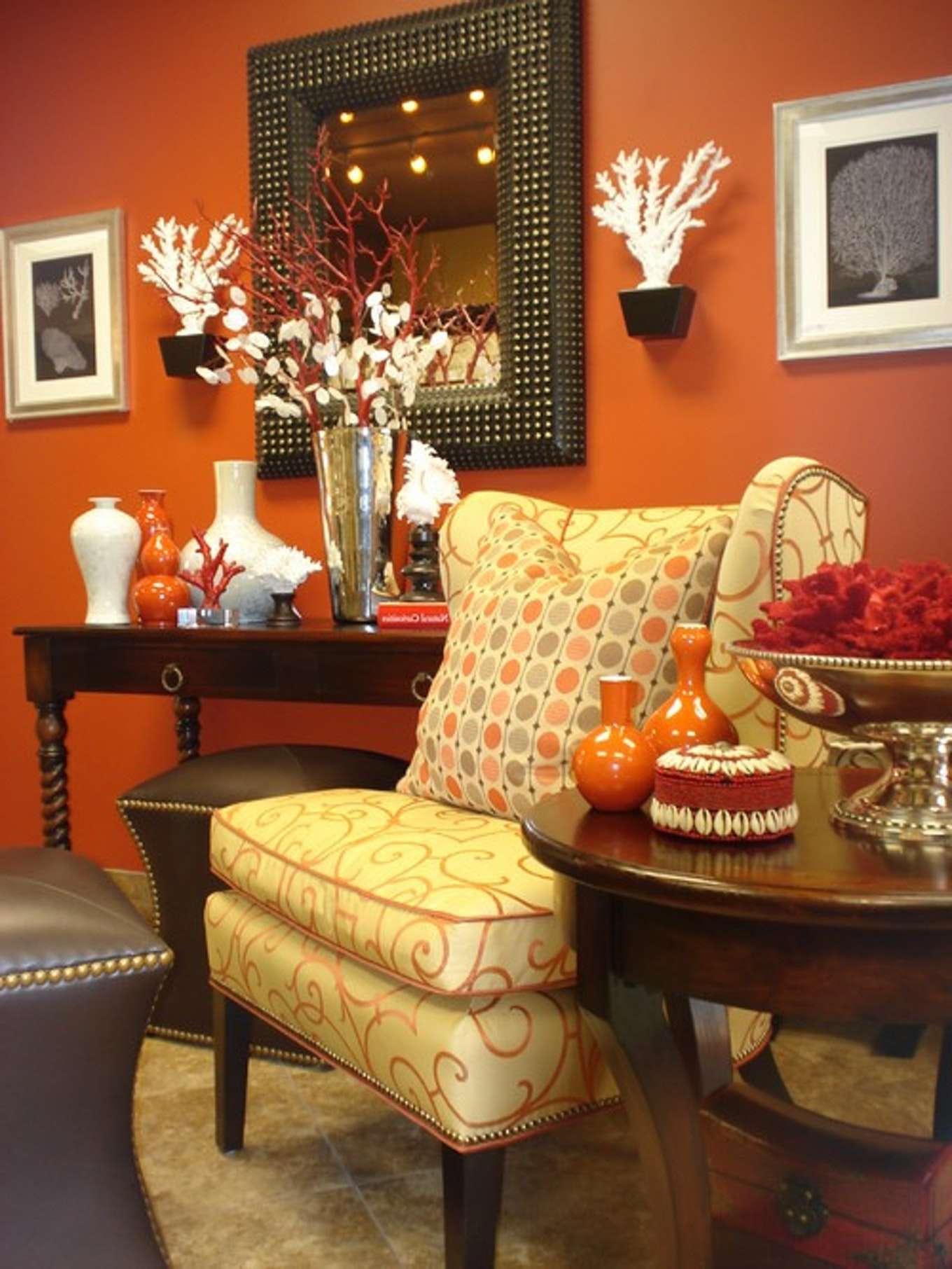 Se você não estiver pronto para mudar a cor das paredes, selecione pinturas artísticas em tons de terracota cor de rosa e vermelho.Ou acentue uma peça de mobília - por exemplo, uma cadeira feita em um tom laranja enferrujado.