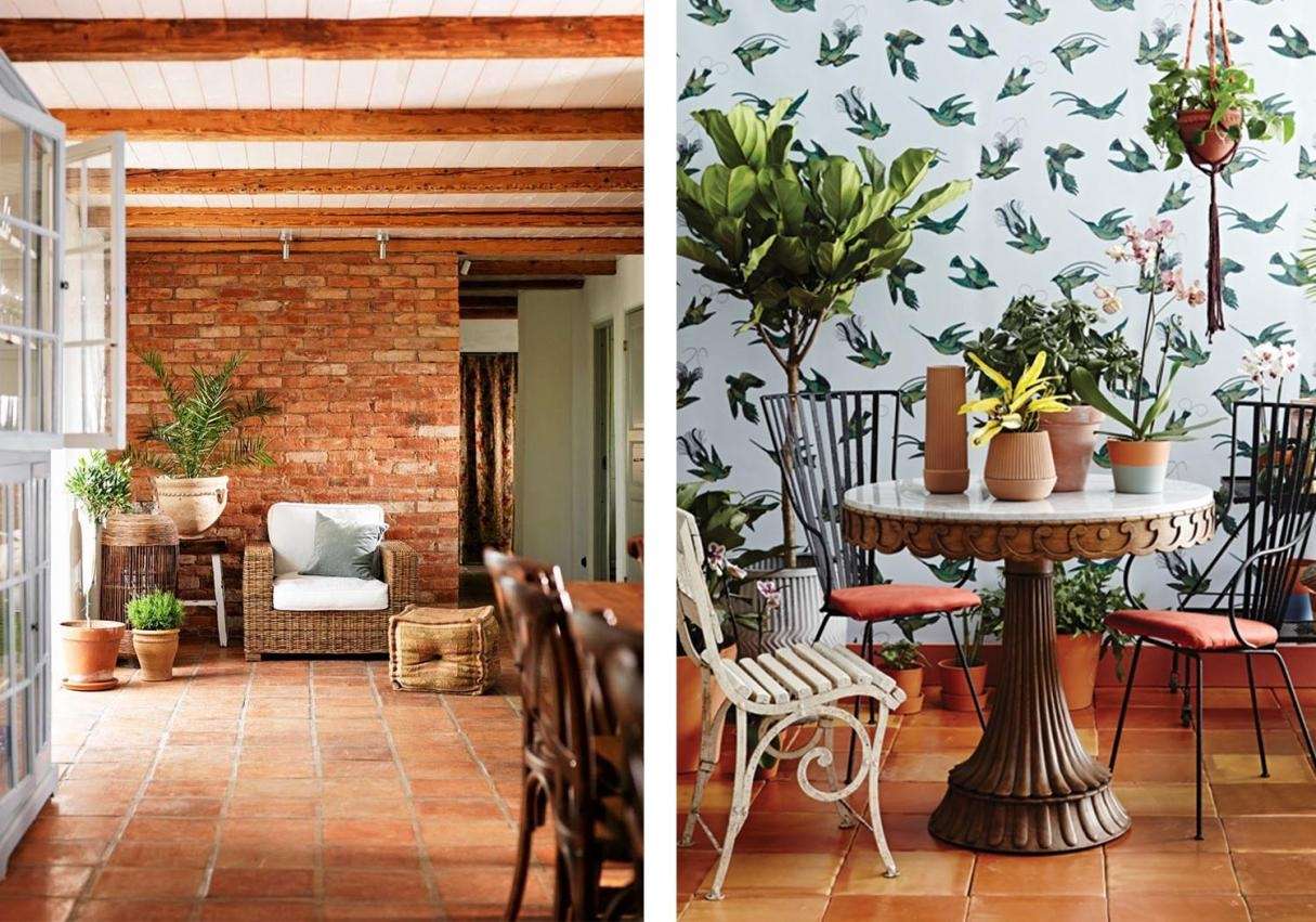 Motivos africanos e desenhos do sul da Europa, paredes com detalhes em amarelo dourado e marrom avermelhado, paredes de tijolos e painéis de madeira, candeeiros de mesa de cerâmica e decoração de casa, panelas de barro ou de plástico e vasos de laranja são adequados para o design de terracota.