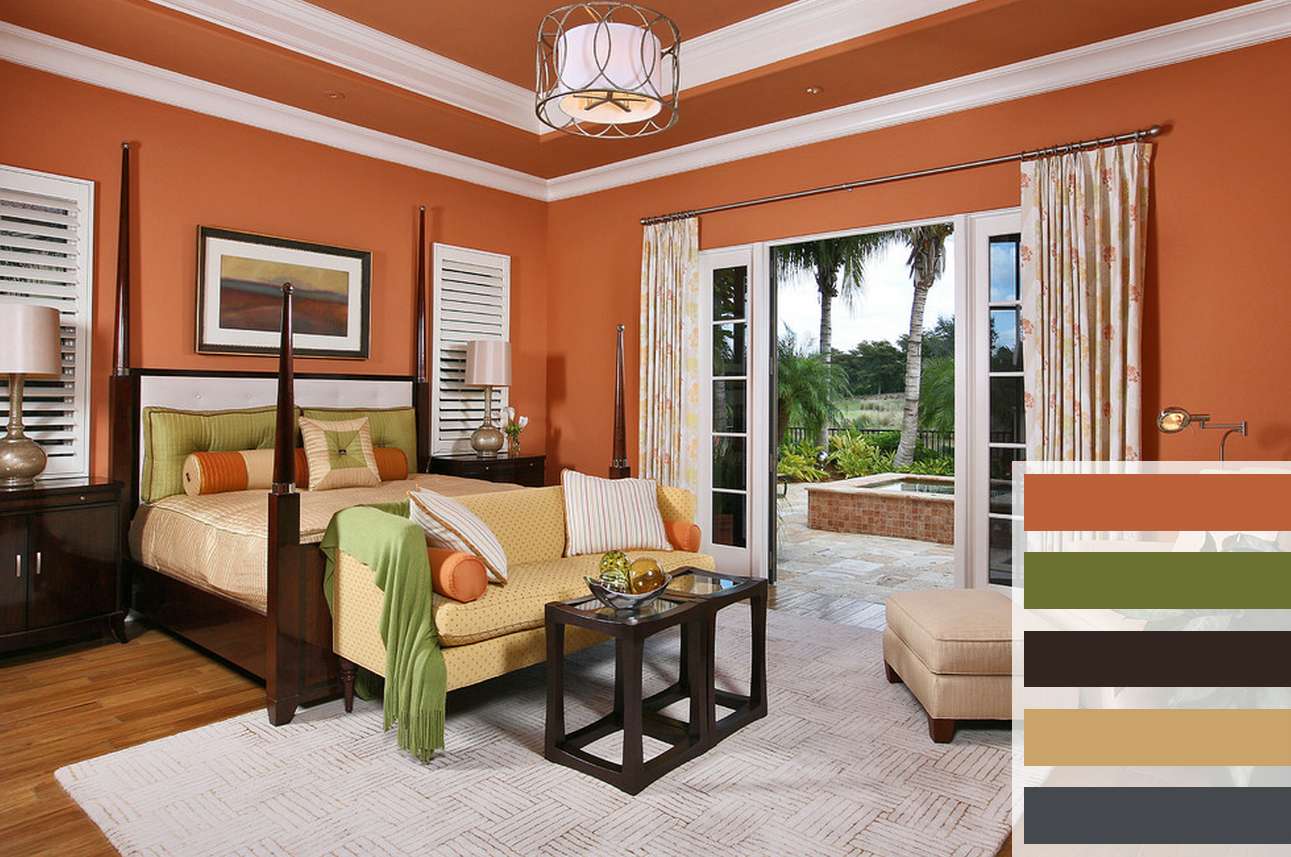 Verdes quentes sempre combinam bem com tons de terra ocre. Para sábio de sombra perfeita de terracota. Desta combinação resulta uma atmosfera calma e abafada. Um tom adicional de cor na faixa verde será roxo, que pode ser encontrado em travesseiros ou outros detalhes.