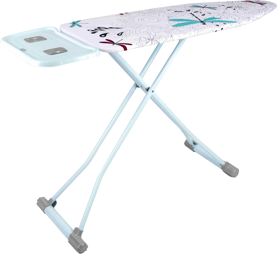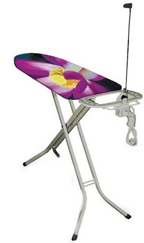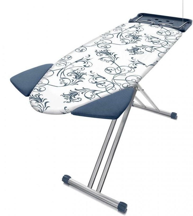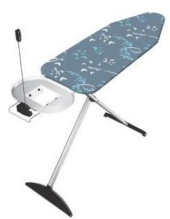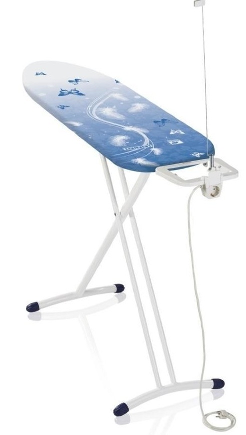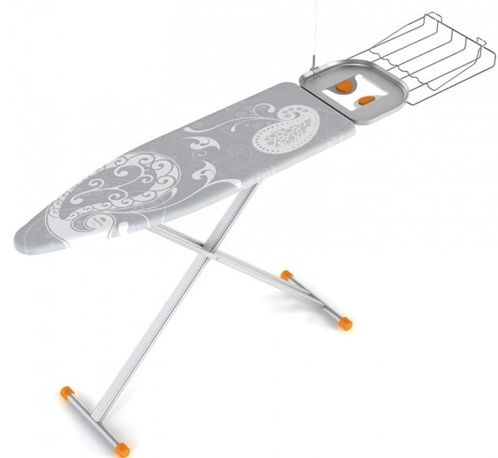 A tábua de passar roupa é projetada para quem aprecia conveniência e economia de tempo. É feito em uma bela cor azul. Sua superfície é feita de material termoplástico, que afeta positivamente o peso do produto (apenas 4,6 kg). Devido ao design bem sucedido, é fácil se decompor e se mover rapidamente. O tamanho ideal da superfície de trabalho possibilita a fabricação de vários produtos. Existe um suporte para ferro, bem como tomada euro com um cabo de extensão. Você pode ajustar a altura à vontade de 80 a 98 centímetros. Feito em branco com um padrão.