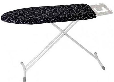 Para aqueles que estão procurando uma tábua de passar a ferro acessível, você deve prestar atenção a este modelo. É feito em preto com padrões. Material da capa - algodão orgânico, a base da mesa é de metal.