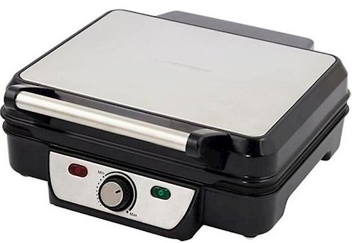 A churrasqueira compacta não ocupará muito espaço na cozinha, mas será um assistente agradável na preparação de vários tipos de carne, legumes, sanduíches. Duas placas são equipadas com um revestimento antiaderente, e o próprio dispositivo é equipado com um conveniente termostato e uma alça emborrachada, o que elimina a possibilidade de queimar durante a operação.