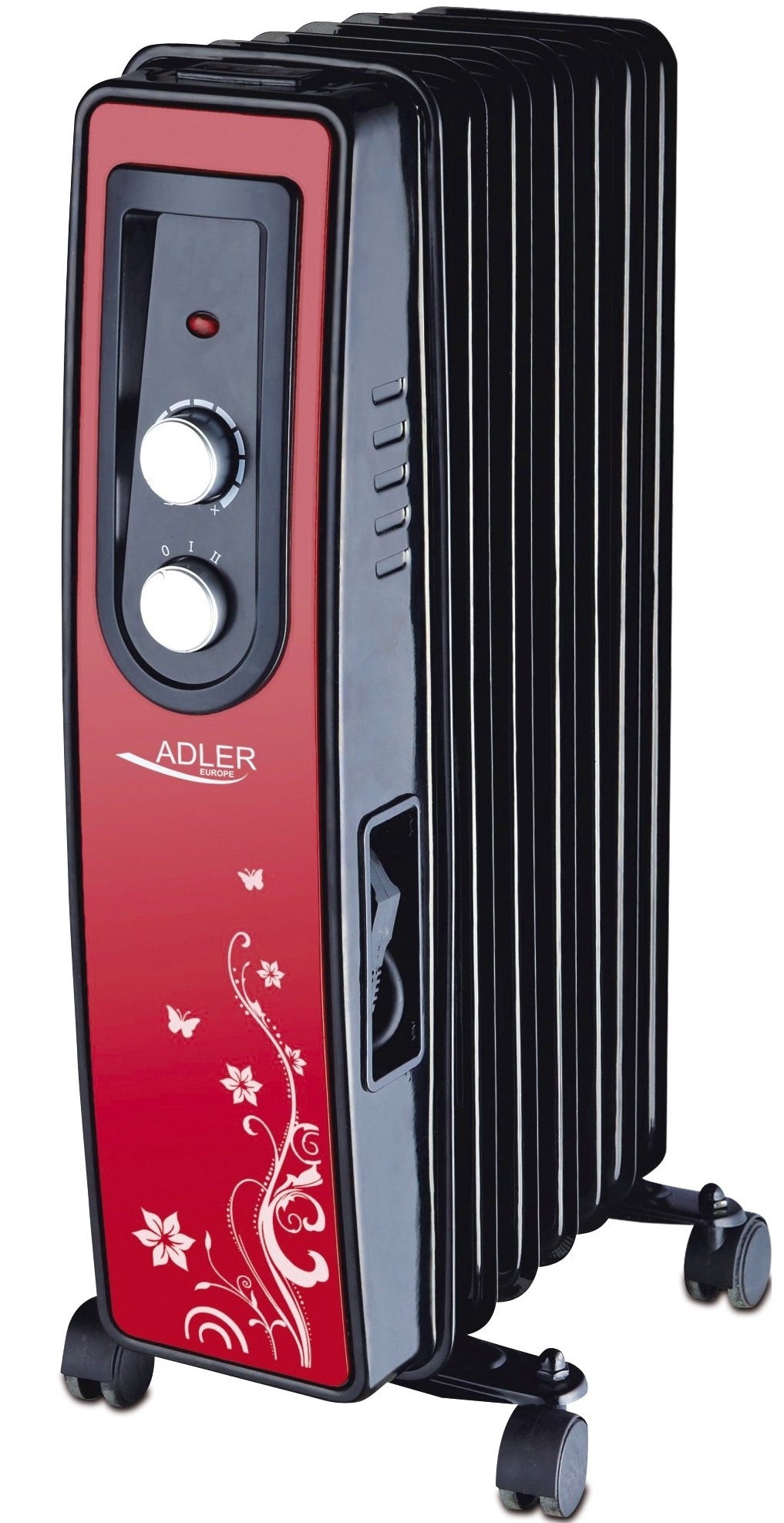 A singularidade do modelo é um design elegante que se destaca no contexto de aquecedores brancos, cinzas padrão. O corpo é feito em vermelho com elementos pretos, decorado com um padrão nas laterais.