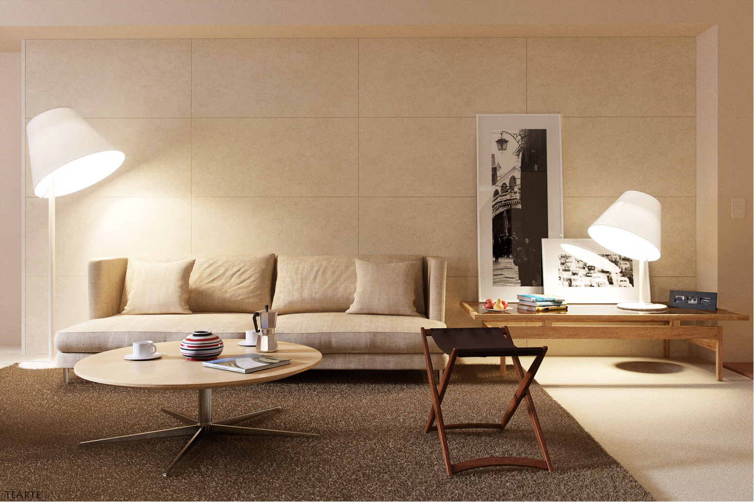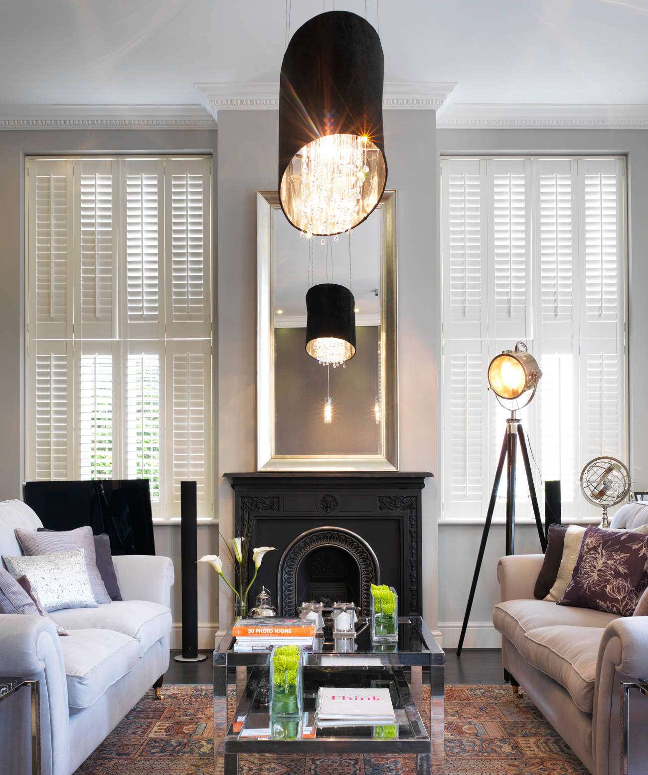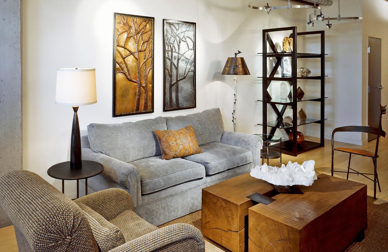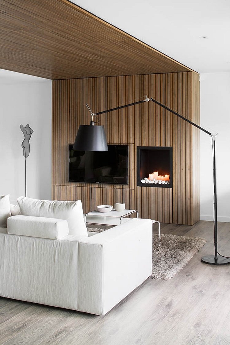 As lâmpadas de assoalho são usadas para preencher o vazio do espaço, para criar conforto. Por exemplo, quando há um lugar em ambos os lados do sofá, lareira, prateleiras. Colocação em ambos os lados visualmente cria simetria e uma certa ordem.