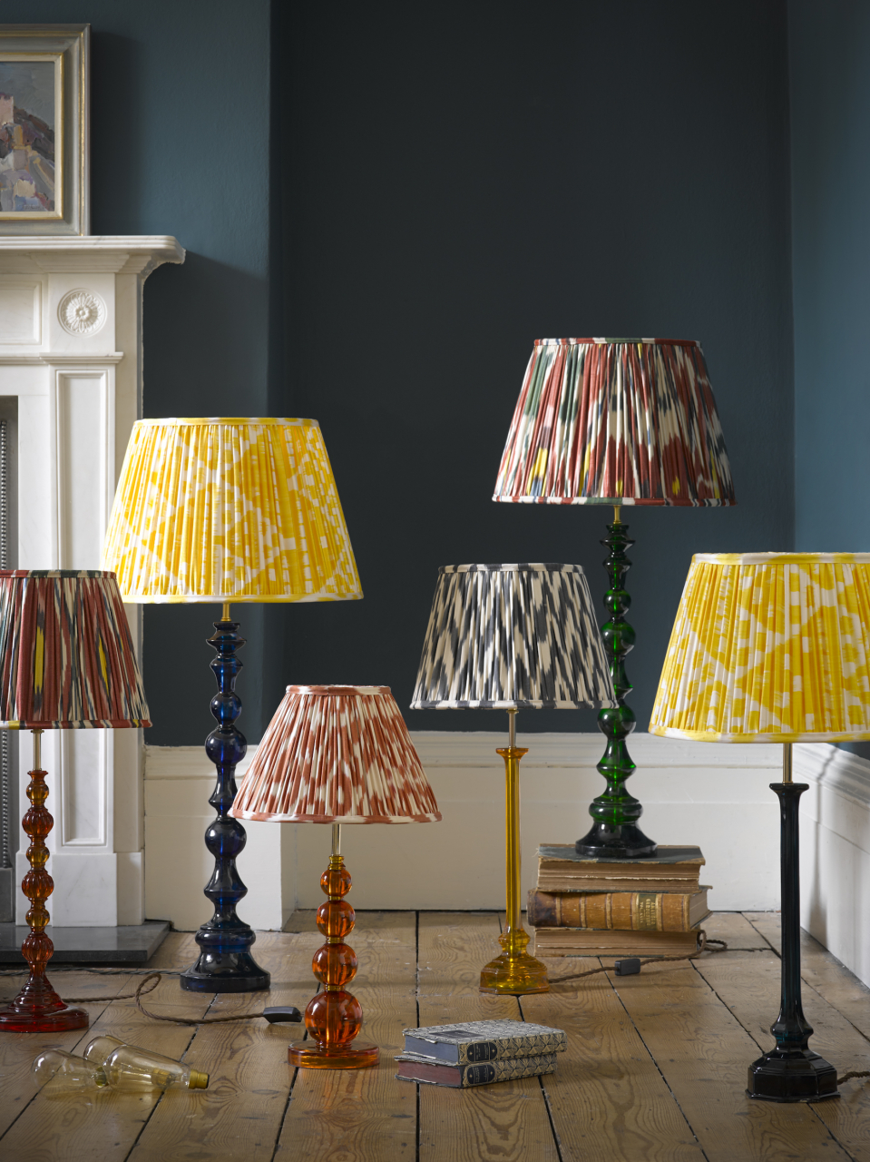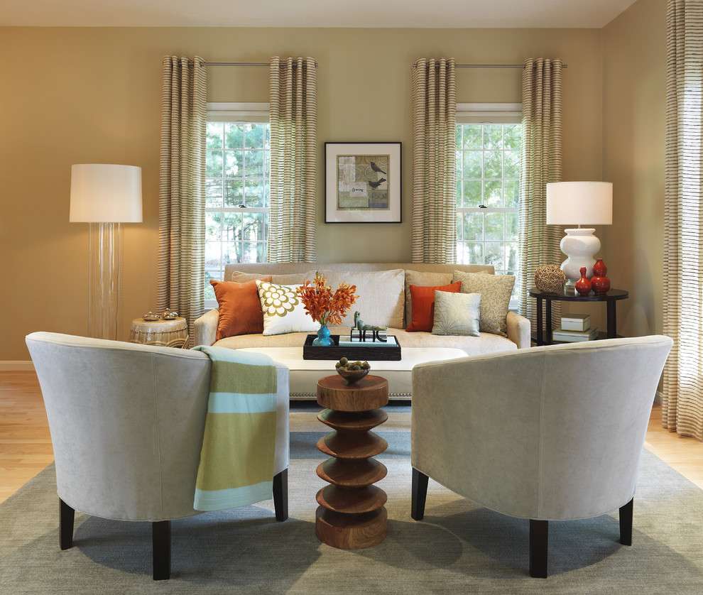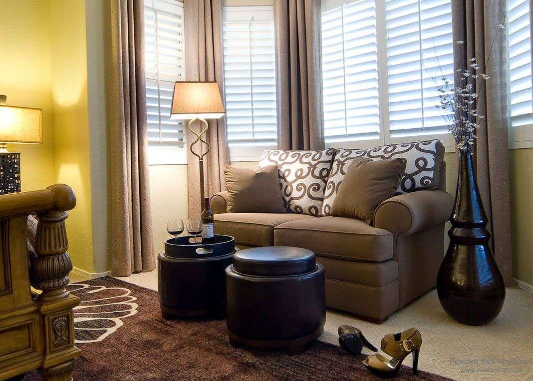 - Em uma cor com mobília. Parece interessante abajur da mesma cor com um sofá, poltrona, cortinas, o principal é organizar esses elementos em lados opostos da sala. Você pode escolher um abajur para combinar papel de parede, o principal não é colocá-lo perto da parede. A sombra do abajur pode diferir em várias cores da cor básica do mobiliário.