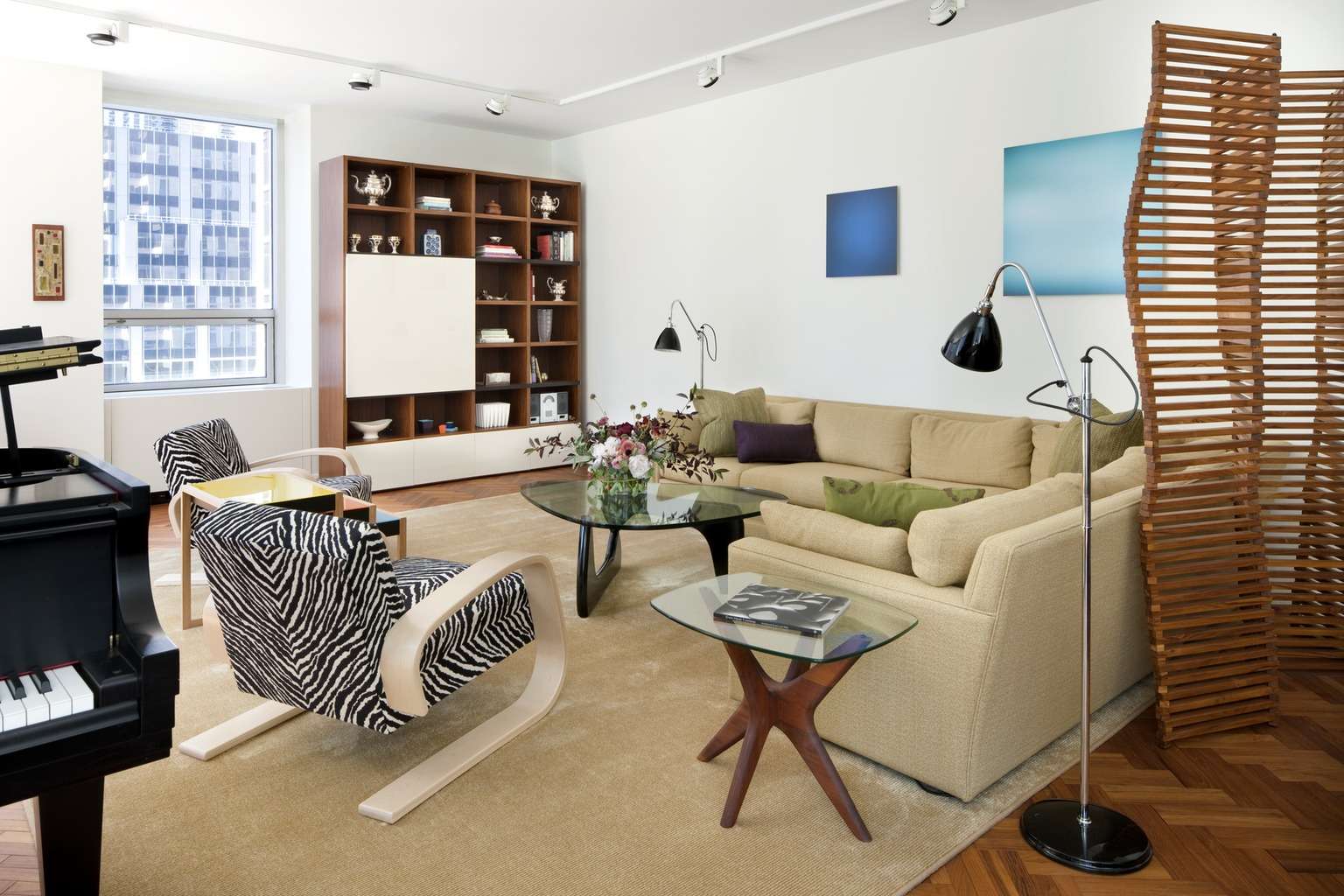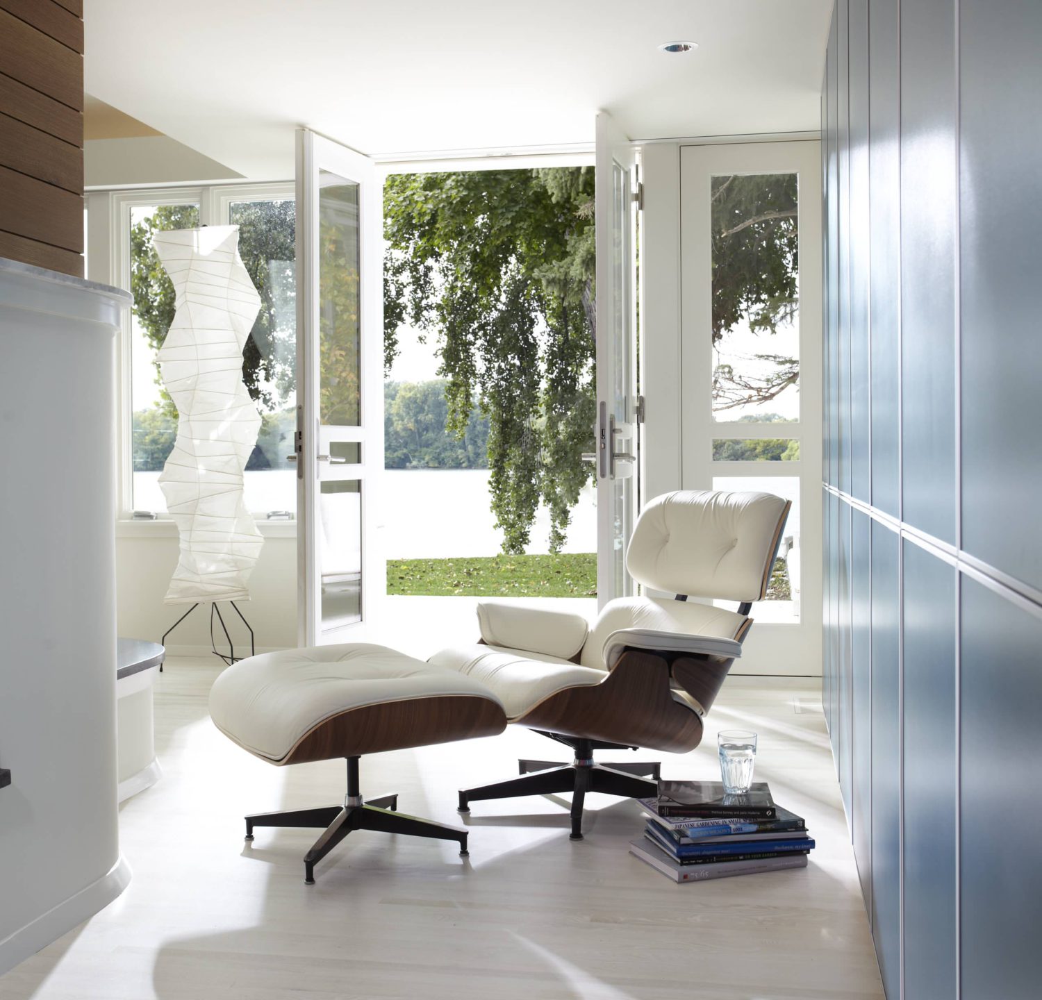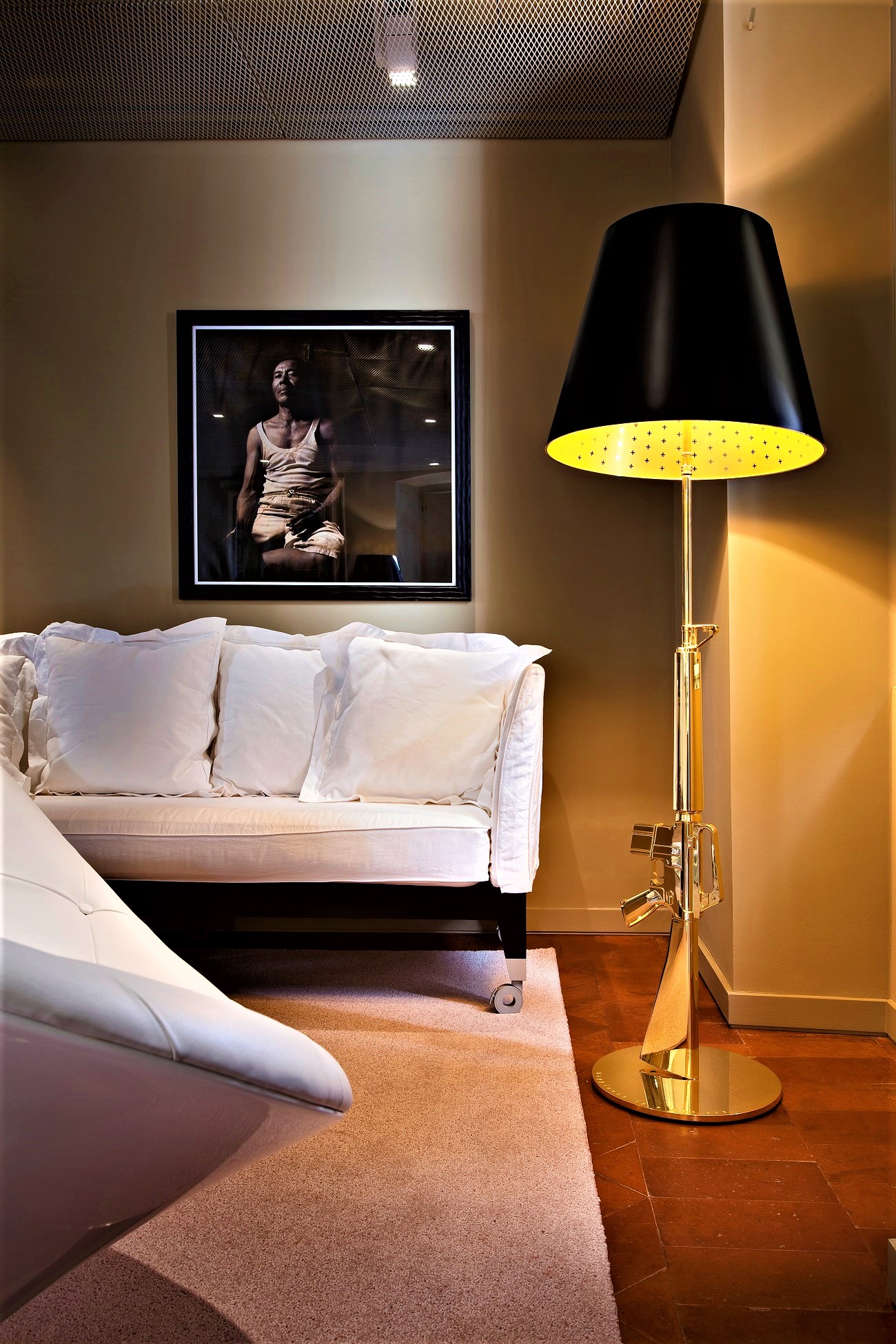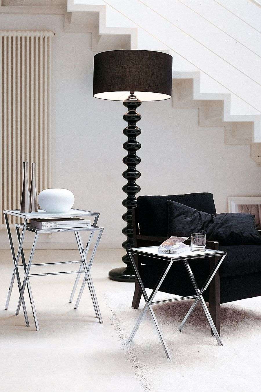 As lâmpadas de assoalho finas e leves com superfície cromada são adequadas para o design de salas ecléticas de alta tecnologia.
