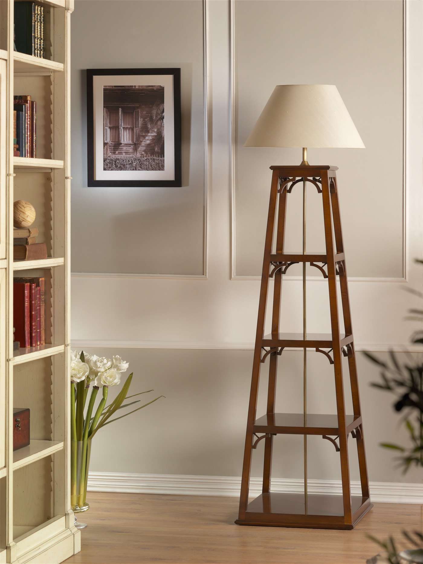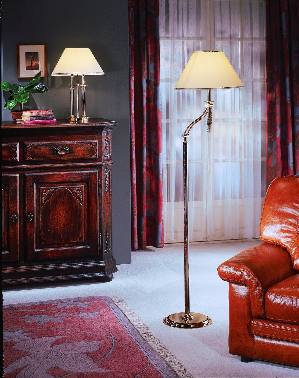 O interior clássico, onde móveis antigos são selecionados, sugere a escolha da mesma lâmpada de assoalho. Deve ter uma base de latão e um abajur cônico têxtil. Ao decorar o abajur pode participar franja, miçangas, bordados.