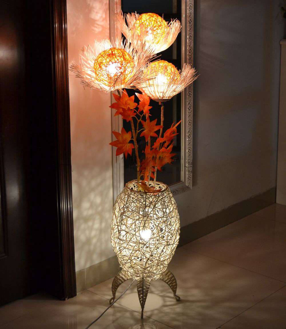 - Estilo oriental. O abajur de tal lâmpada de assoalho é feito de seda grossa, vidro multi-colorido, rattan. O quadro da luminária de pé consiste em metal amarelo, bronze, cobre.