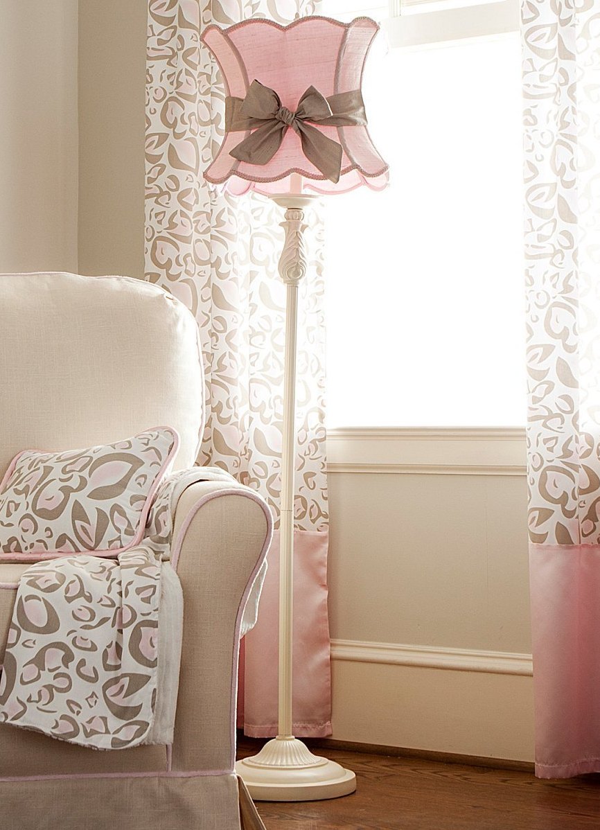 Lâmpada de assoalho pode ser colocado em quarto das crianças. Mas, aqui, é necessário pegar algo interessante, brilhante e divertido. Se este é o quarto de um menino, então o abajur pode ser vasculhado com bolas coloridas, bolas. Se houver uma garota morando na sala, você pode pegar um abajur rosa claro com flores, ervilhas ou algo neutro.