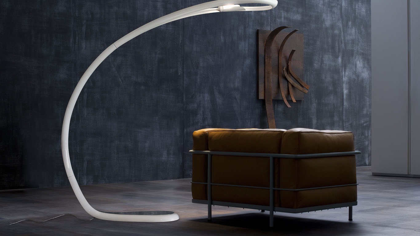 Há lâmpadas de assoalho em um suporte curvo. Tal suporte é geralmente feito de metal. Eles podem ser usados para interiores de salas de estilos como minimalismo, sótão, alta tecnologia. O design é futurista, tais lâmpadas também são chamadas de "arqueadas". O abajur de tal dispositivo pode ser feito como uma bola de vidro ou um cilindro de plástico. Eles são geralmente produzidos branco, cinzento, preto cores, mas se você procurar, você pode encontrar modelos brilhantes, este movimento ajudará a enfatizar o interior da sala.