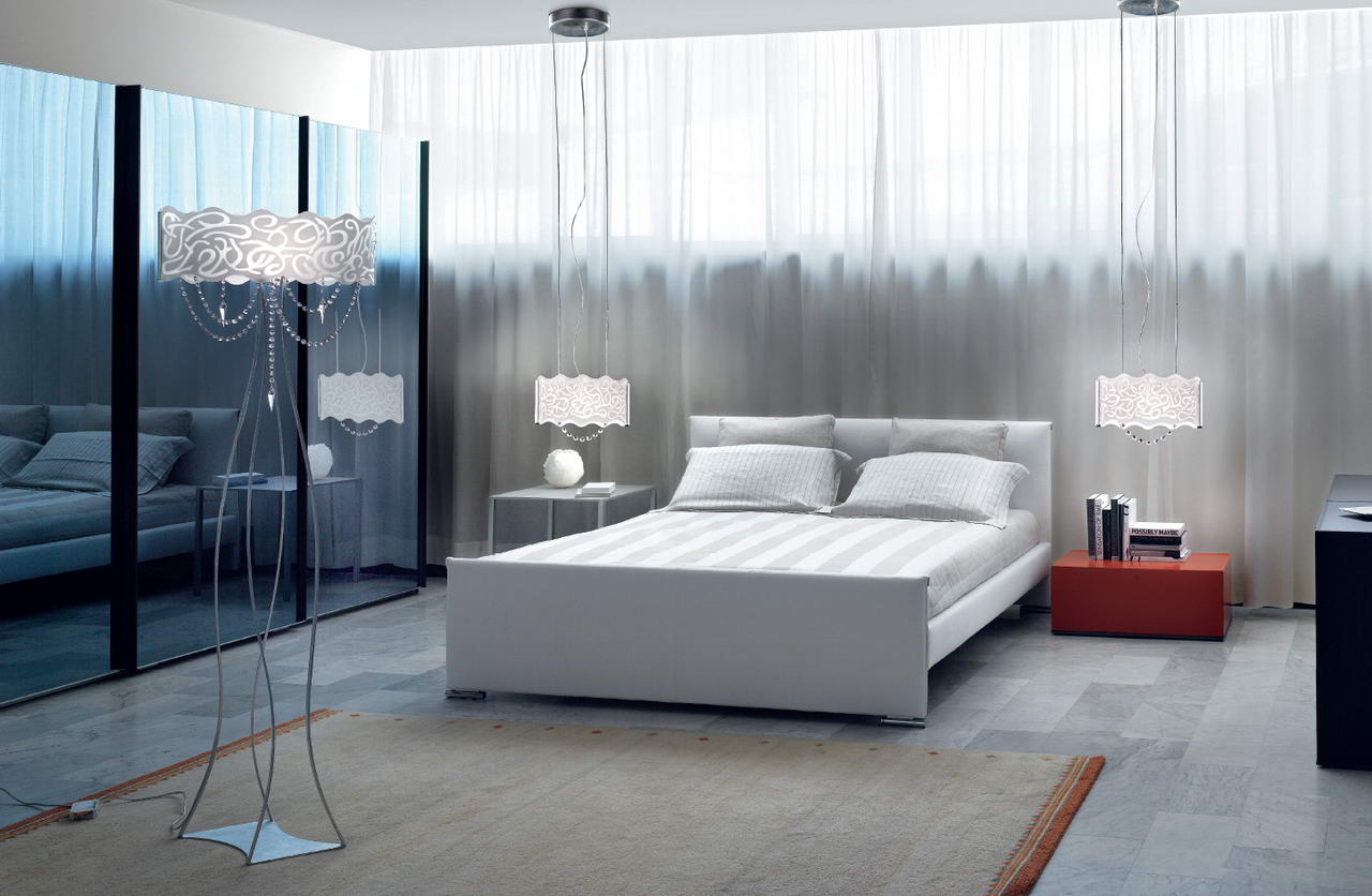 Se a cama é dupla, então pequenas lâmpadas de assoalho podem ser colocadas em ambos os lados, se for uma cama de solteiro, pode haver uma mesa de um lado, cabeceirae na outra lâmpada de assoalho. Tal movimento será interessante, funcional e conveniente.Ao escolher uma luminária de chão para o quarto, você precisa prestar atenção ao controle de nível de luz embutido.