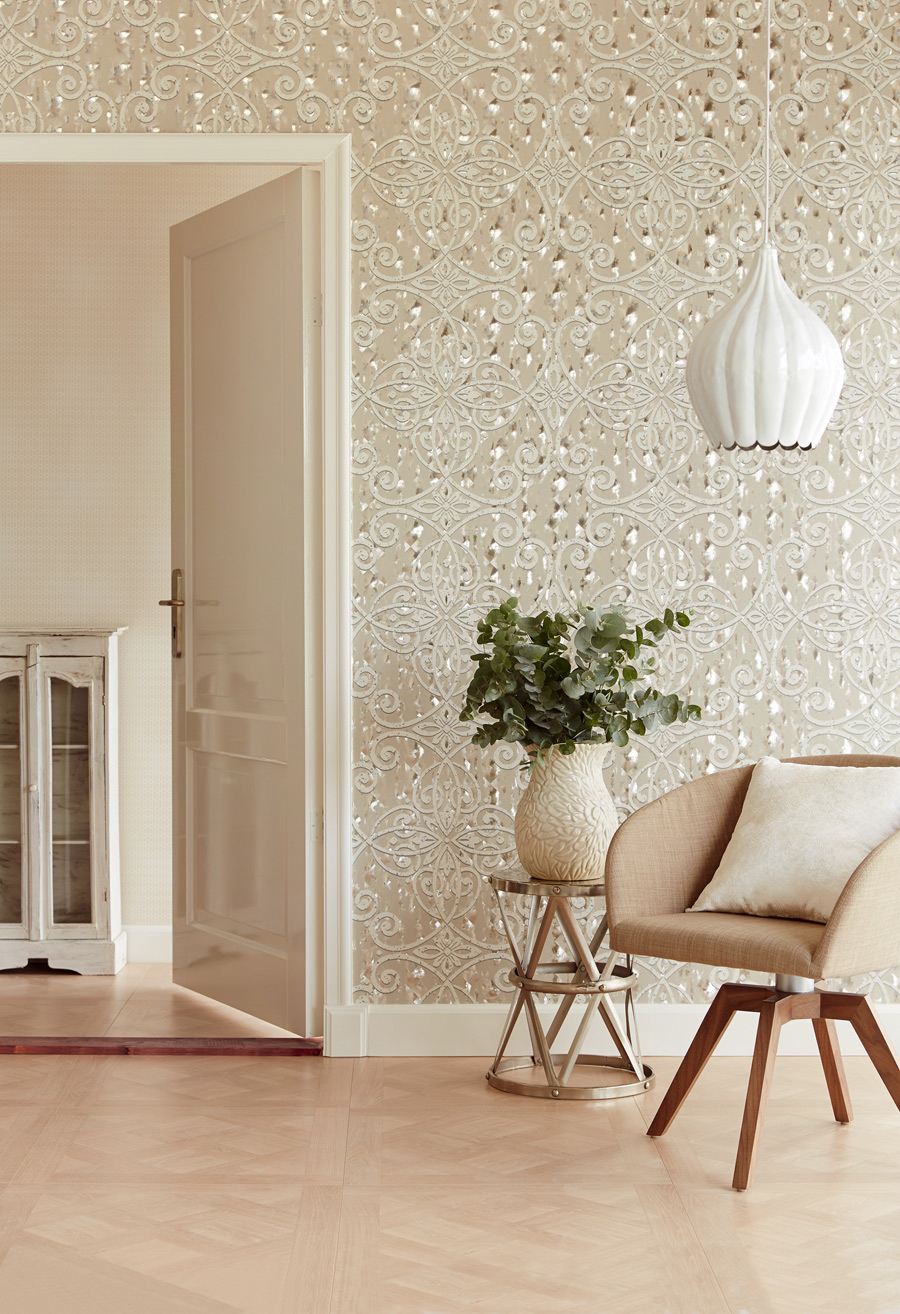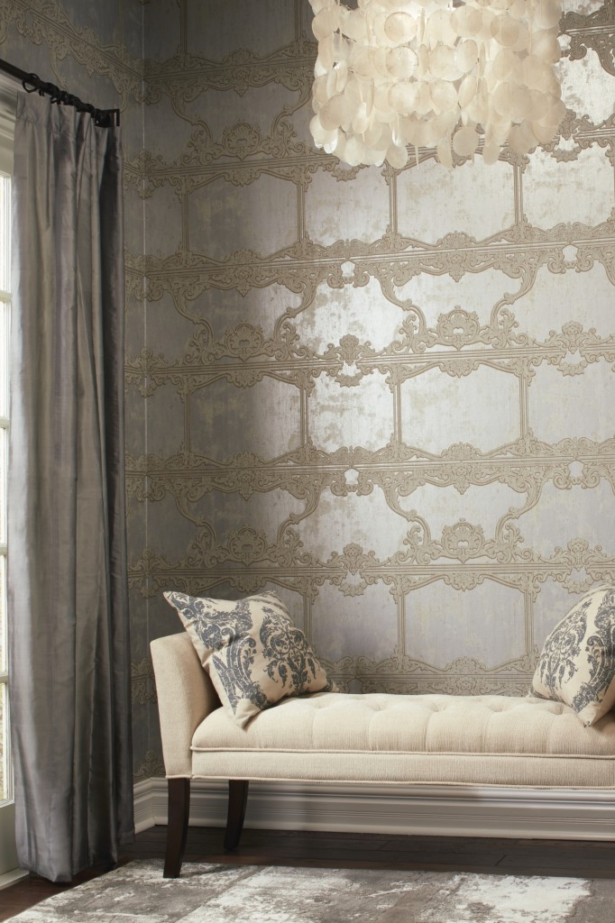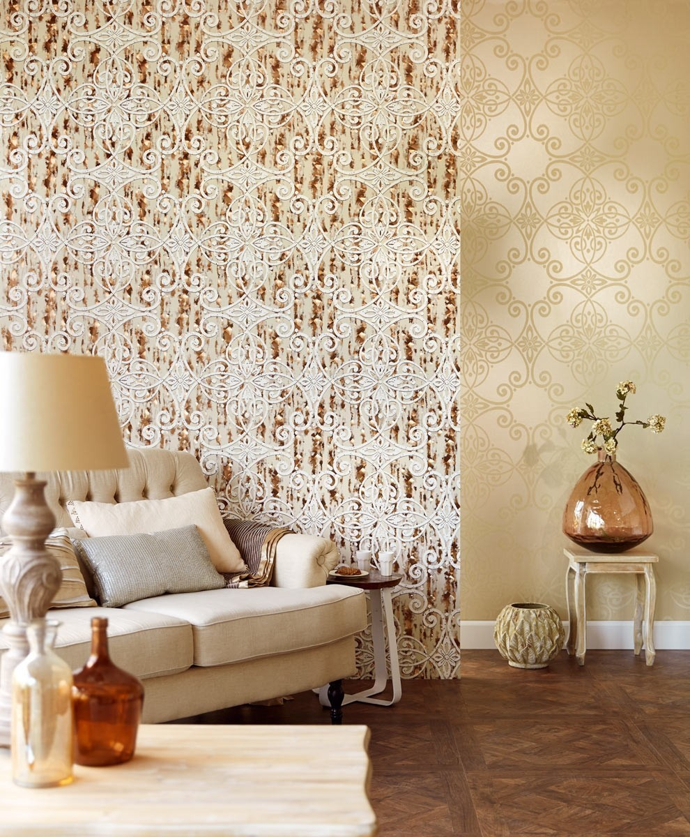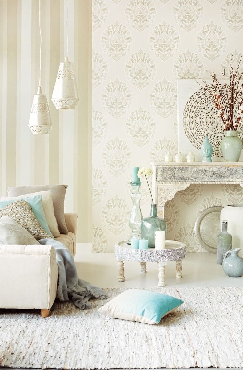 - Quando os móveis da sala têm uma forma simples e os têxteis são tão simples, é melhor escolher um papel de parede com um enfeite.