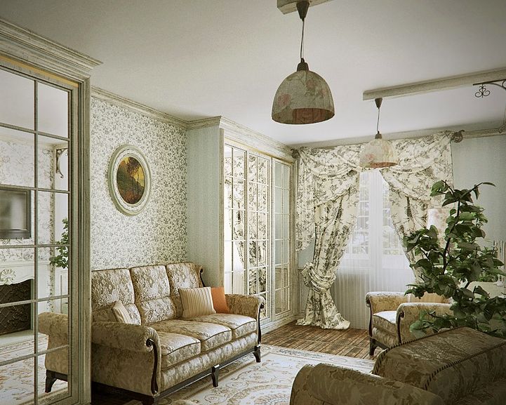 - O estilo de fusão se destaca. Deve haver rolos usados com diferentes tonalidades. Para suavizar esses rolos precisam de móveis marrom ou branco. As paredes podem ser rebocadas e papel de parede dourado.