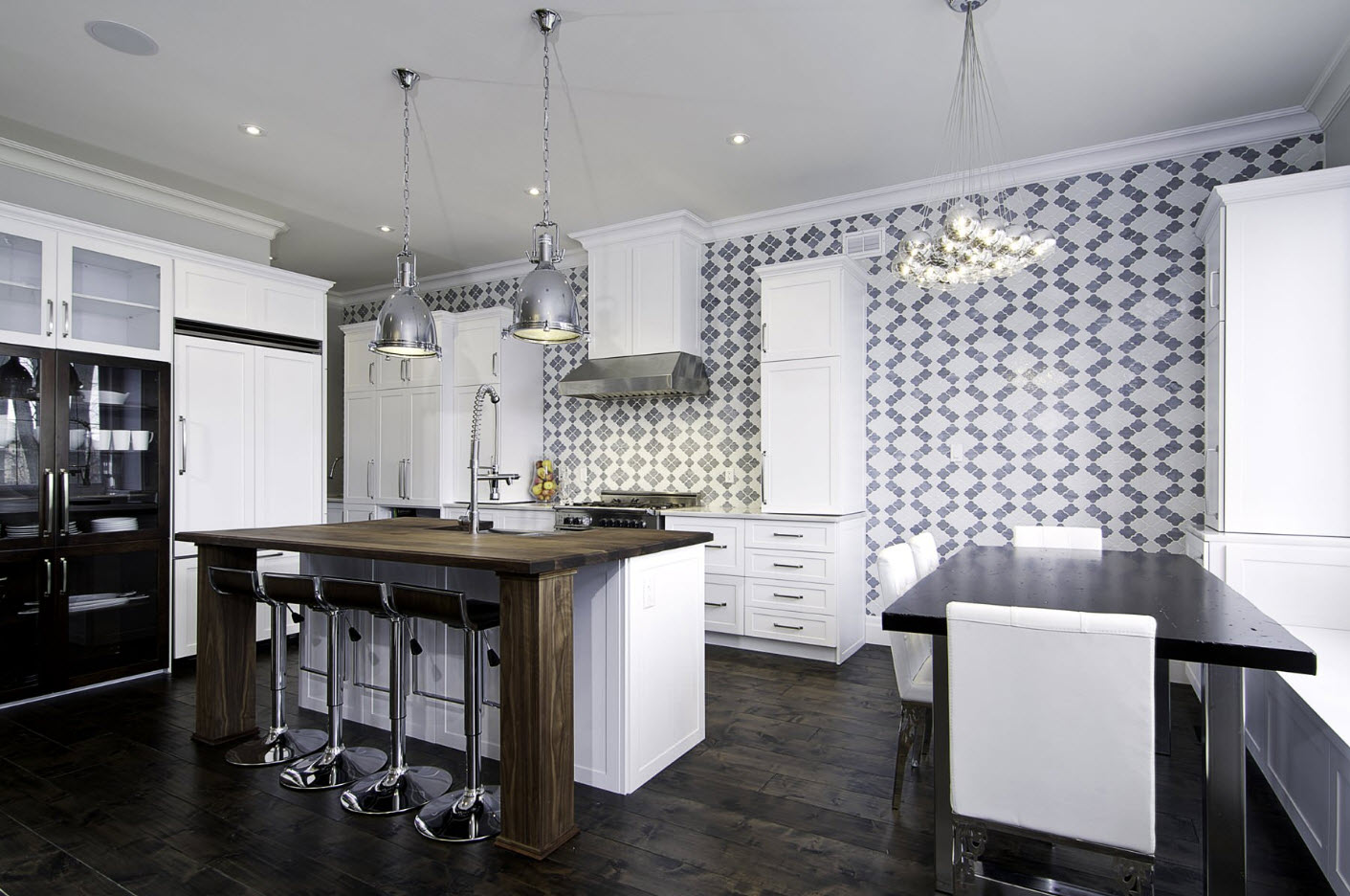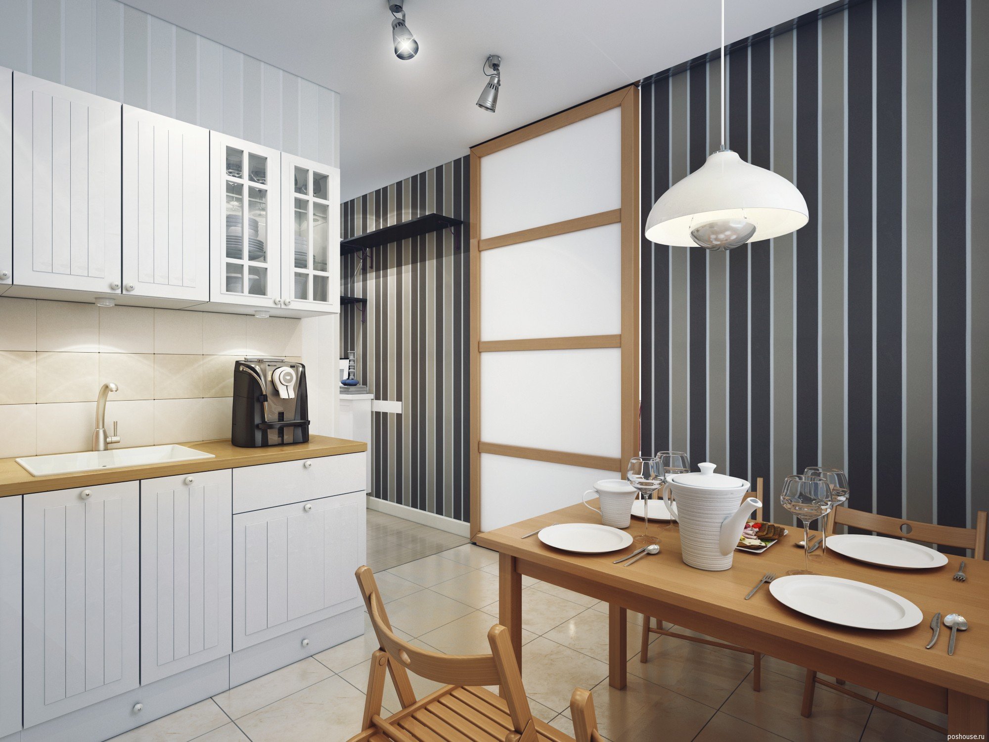 - Se não há pensamentos especiais em sua cabeça, você sempre pode usar papéis de parede brancos. Você pode combinar papel de parede branco e escuro. Papel de parede branco em cozinhas compactas é um clássico. A configuração branca como a neve facilita a sala. Você pode usar papel de parede branco como plano de fundo de sombreamento. Em seguida, concentre-se em laranja, azeitona ou até vermelho.