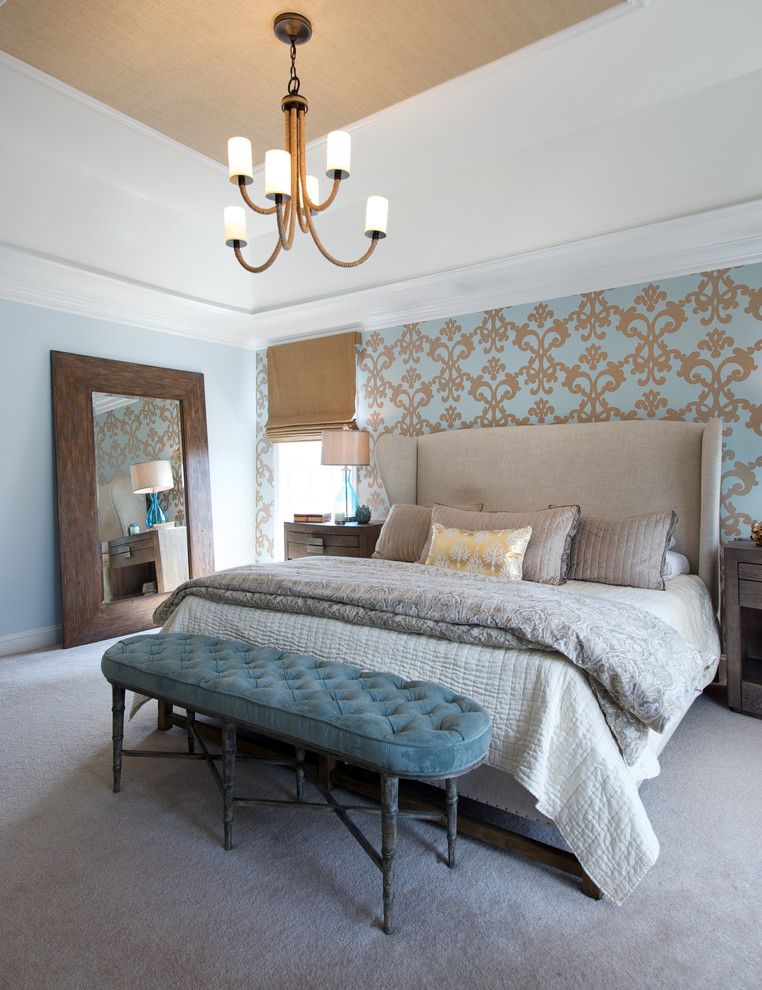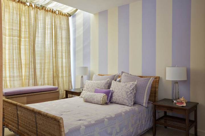 Para as instalações de zoneamento, use listras horizontais. Abaixo das premissas são usados papel de parede escuro com um padrão dinâmico. No topo da sala haverá tons calmos. Listras verticais podem ser feitas monofônicas. A largura das tiras pode ser escolhida da mesma forma que as dimensões da cama. O material pode, como chegar ao teto, bem como ir para ele. Inserções são necessárias para alocar espaço. Muitas vezes, alocar a área acima da cama.