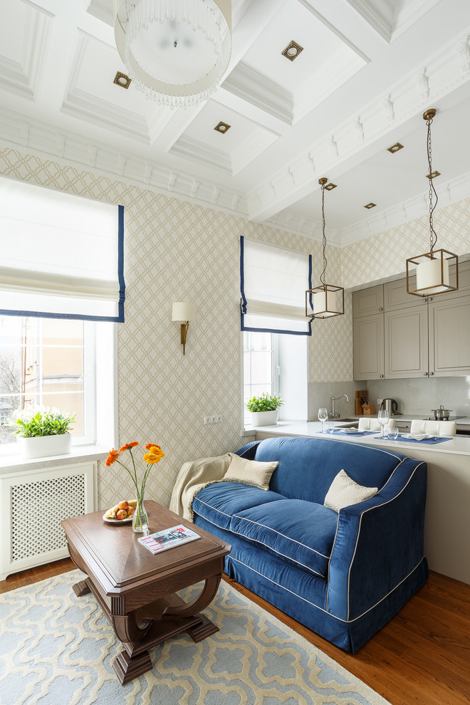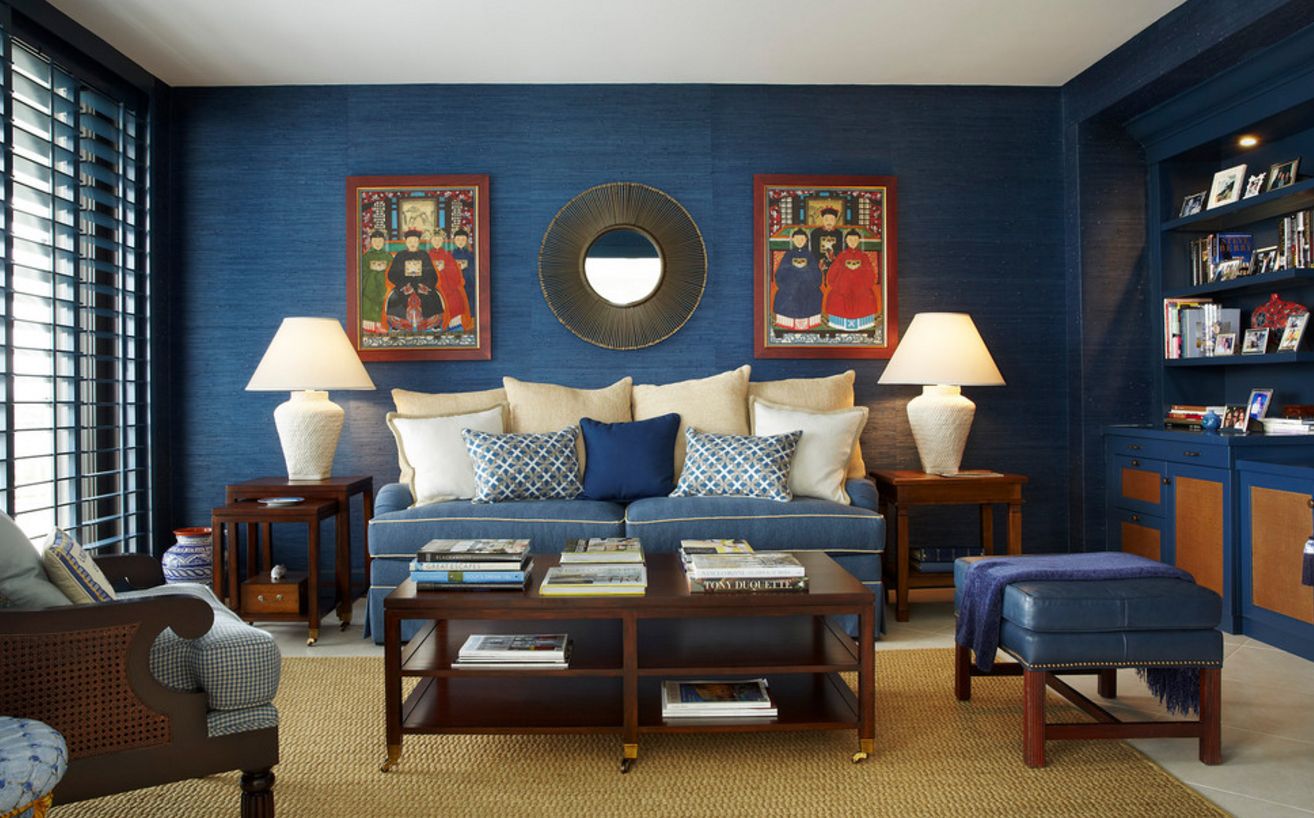 Agora está na moda para comprar móveis azuis. Na aparência, parece elegante, caro. Azul não é chato. O fundo da sala depende do propósito da sala de estar. O uso da sala de estar para lazer requer o uso de vermelho ou amarelo.
