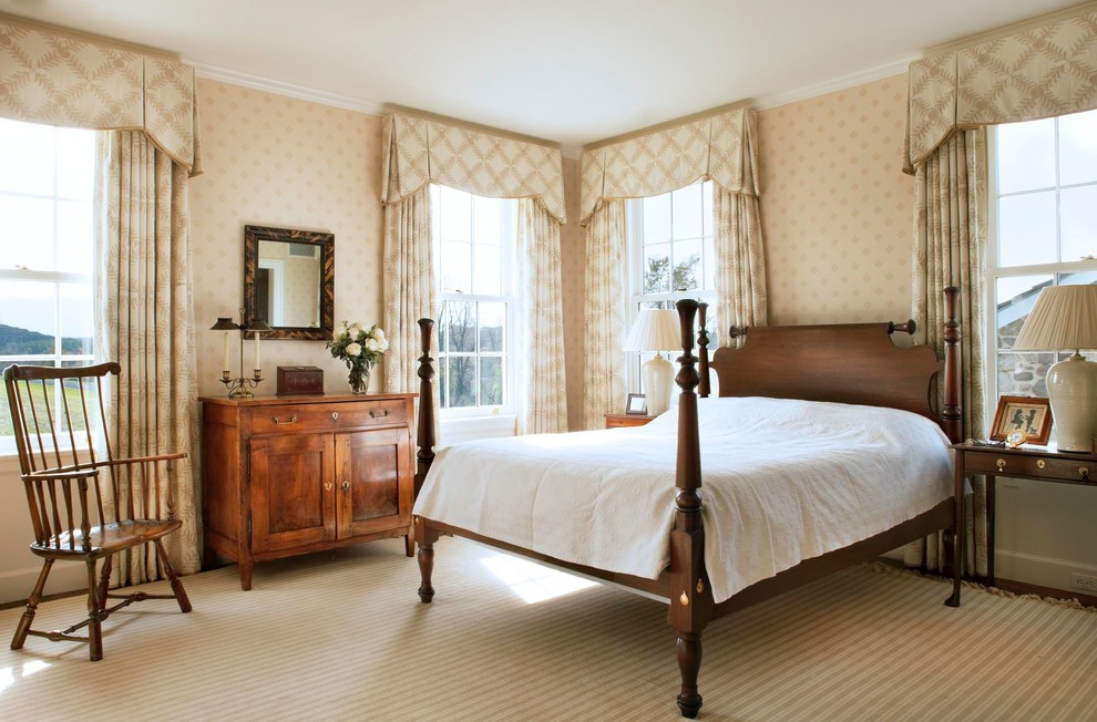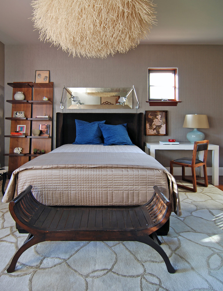 Quanto à sala de estar, para o quarto os lados do mundo desempenham um grande papel. Especialmente se o proprietário do apartamento estiver interessado em feng shui. Se as janelas estiverem voltadas para o sul, não haverá problemas com a luz. Depois do jantar haverá muita luz, por isso precisa ser absorvido: