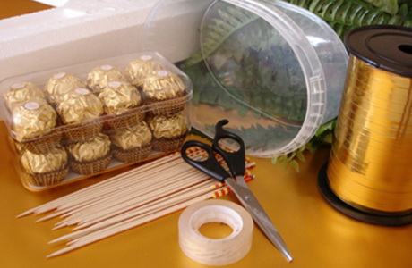 Primeiro de tudo, você precisa estocar os seguintes materiais: corrugação (para o talo escolha verde, e para o botão que aprova a sua imaginação), um pequeno bastão de doces, linha, tesoura, fita adesiva, arame.