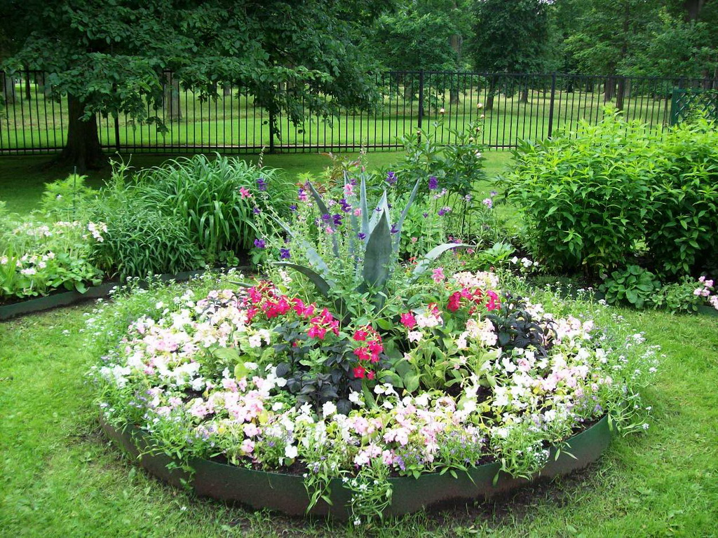 Como na criação de um canteiro de flores redondo, as plantas altas estão localizadas no centro, têm baixo crescimento. Ao longo das bordas, você pode plantar coberturas no solo.