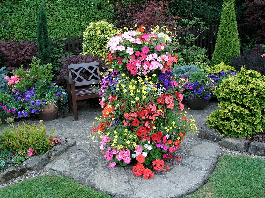 Outra versão universal dos arranjos florais é vertical. Esta opção é adequada para aquelas áreas suburbanas muito pequenas. A maneira mais fácil de criar um canteiro vertical é uma “tela de madeira” com flores trepadeiras. Você pode montá-lo e plantar algumas plantas ao lado dele, ou usar cercas vivas.