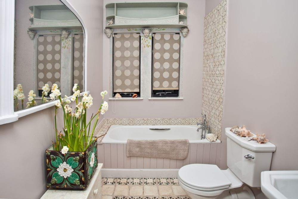 Em salas de estar clássicas e espaçosas, as banheiras de grandes dimensões podem ser posicionadas simetricamente em relação a uma janela, espelho ou outro objeto.