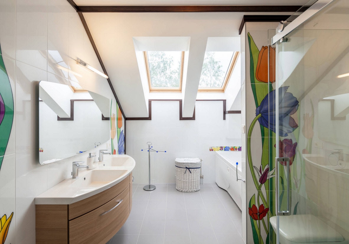 Flores em casa de banho adicione a elegância do quarto. Na maioria das vezes com uma telha de impressão floral é escolhido em grandes casas de banho. O espaço da sala permite-lhe carregar toda a imagem. Tais motivos são bem combinados com um fundo monofônico, azulejo claro.