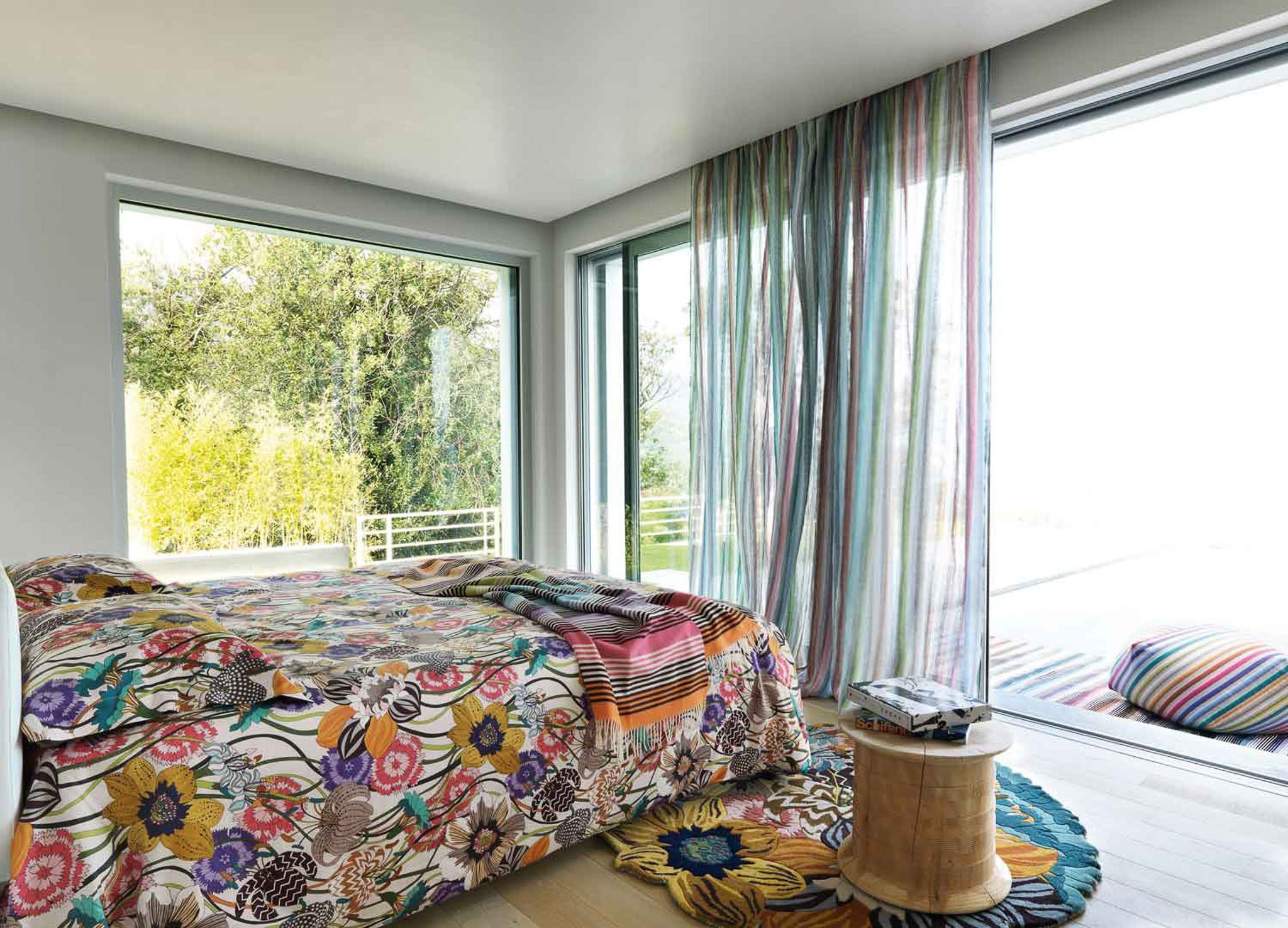 - Estampa floral no design das janelas vai bem com paredes listradas.